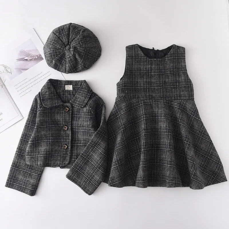 Комплект одежды для маленьких девочек, новый зимний модный шерстяной комплект из 3 предметов, пальто с длинными рукавами + платье-пачка + шапочка, комплекты для маленьких девочек, Детский костюм