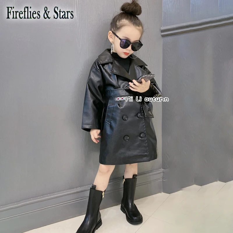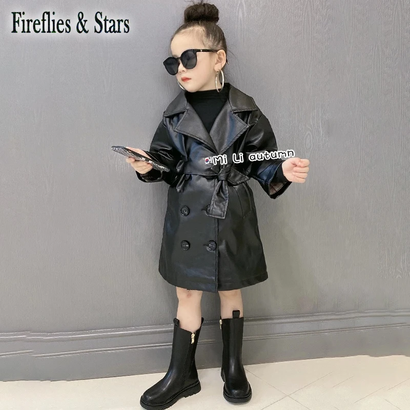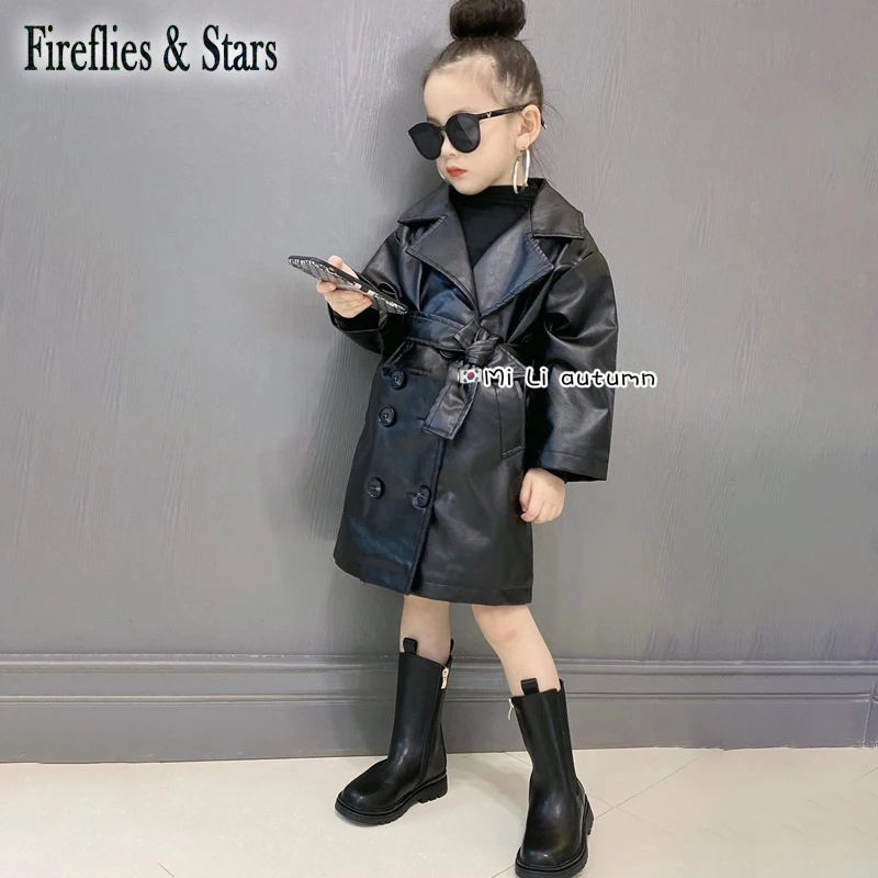 Имя:Демисезонная куртка из искусственной кожи для девочек детское длинное пальто Верхняя одежда для малышей, Детская уличная одежда модный английский пояс, черный, от 3 до 14 лет