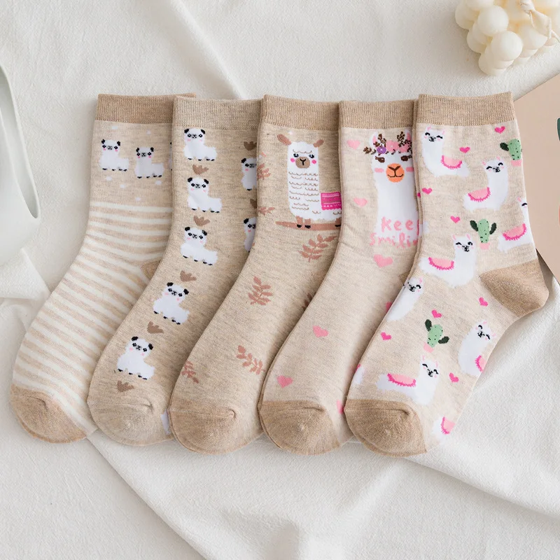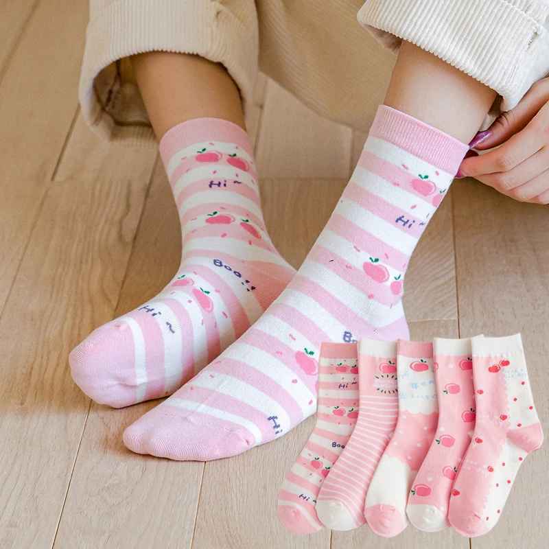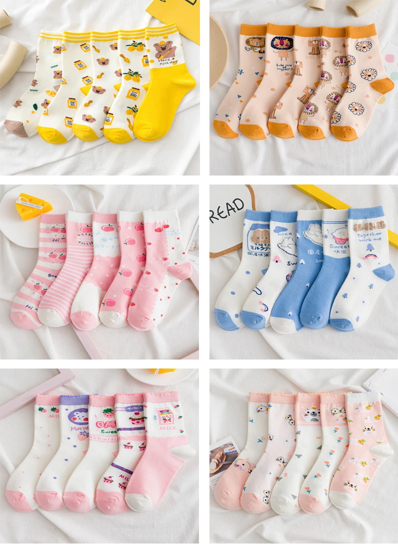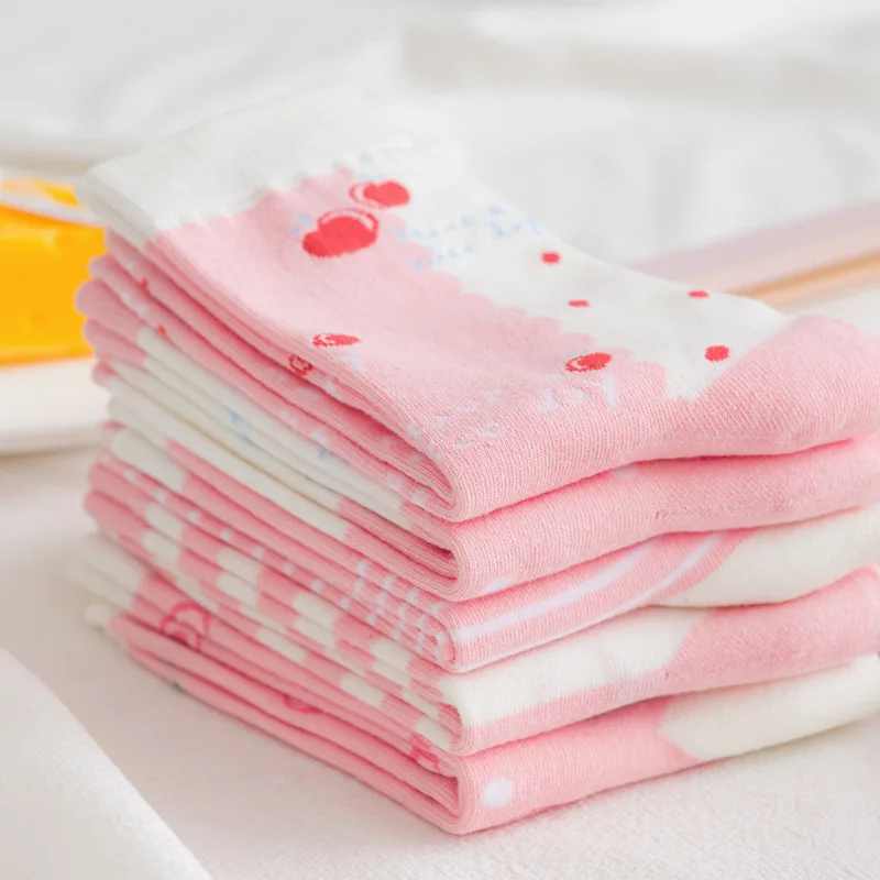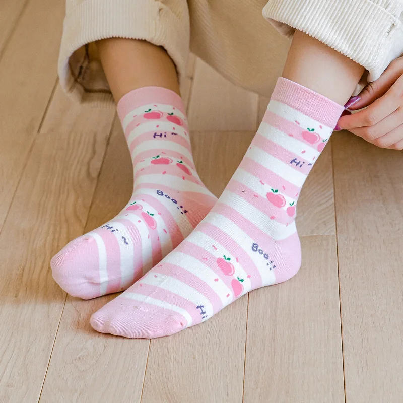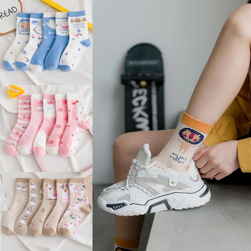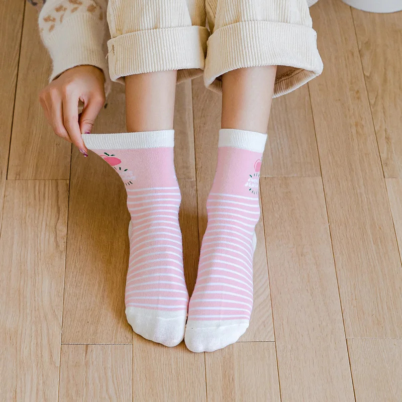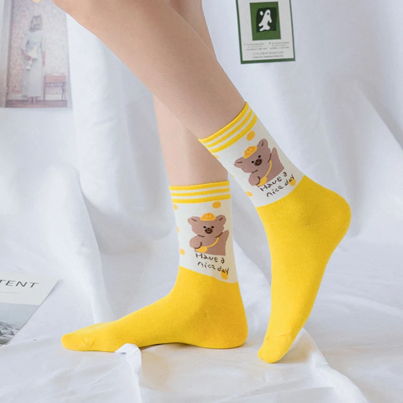 Носки женские, хлопковые, полосатые, с принтом медведей, кроликов, 5 пар