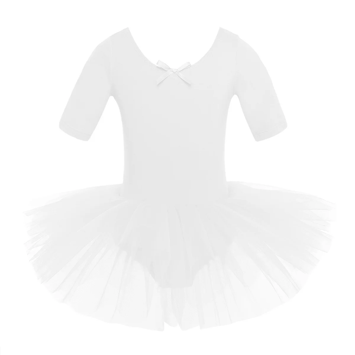 Особенности: Детское балетное танцевальное трико для девочек; Платье с короткими рукавами. Таблица размеров означает возраст для девочек, но только для общего руководства. U-образный вырез с несъемным бантом спереди, ремешки крест-накрест сзади. 4-х слойная Юбка со встроенным трусы-Шортики внизу. Подходит для занятий танцами, гимнастическое упражнение, выступления на сцене и т. д.