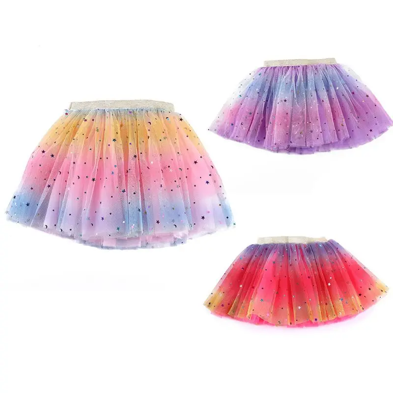 3 многослойное градиент радужного цвета, юбка-пачка из мягкого фатина, украшенный хлопчатобумажной ткани, украшенные яркого цвета с блестками звезд и Луны с блестками.