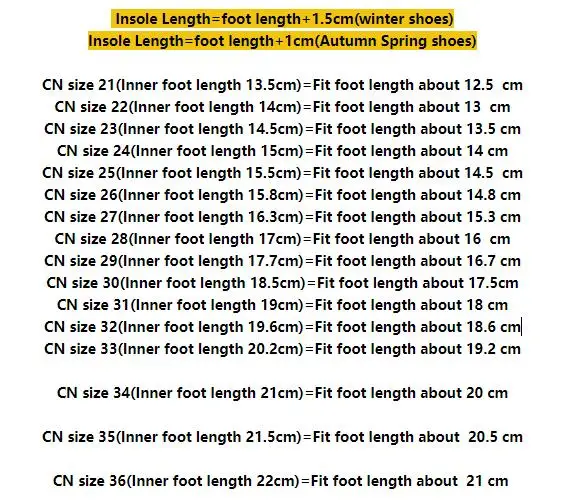 Стельки Длина = стопы Длина + 1,5 см (зимней обуви)Длина стельки = длина стопы + 1 см (Демисезонная обувь) Размеры CN; 21 (размеры соответствуют внутренней длине стопы 13,5 см) = соответствует европейскому размеру длины стопы около 12,5 см Размер CN 22 (Длина внутренней стопы 14 см) = длина стопы около 13 см CN Размер 23 (размеры соответствуют внутренней длине стопы 14,5 см) = соответствует европейскому размеру длины стопы около 13,5 см Размер CN 24 (Длина внутренней стопы 15 см) = длина стопы около 14 см CN Размеры 25 (размеры соответствуют внутренней длине стопы 15,5 см) = соответствует европейскому размеру длина стопы около 14,5 см Размер CN 26 (Длина внутренней стопы 15,8 см) = длина стопы около 14,8 см Размер CN 27 (Длина внутренней стопы 16,3 см) = длина стопы около 15,3 см Размер CN 28 (Длина внутренней стопы 17 см) = длина стопы около 16 см Размер CN 29 (Длина внутренней стопы 17,7 см) = длина стопы около 16,7 см Китайский размер 30 (размеры соответствуют внутренней длине стопы 18,5 см) = соответствует европейскому размеру длины стопы около 17,5 см Размер CN 31 (Длина внутренней стопы 19 см) = длина стопы около 18 см Размер CN 32 (Длина внутренней стопы 19,6 см) = длина стопы около 18,6 см Размер CN 33 (Длина внутренней стопы 20,2 см) = длина стопы около 19,2 см Размер 34 CN (Длина внутренней стопы 21 см) = длина стопы около 20 см CN Размер 35 (размеры соответствуют внутренней длине стопы 21,5 см) = соответствует европейскому размеру длины стопы около 20,5 см Размер 36 CN (Длина внутренней стопы 22 см) = длина стопы около 21 см