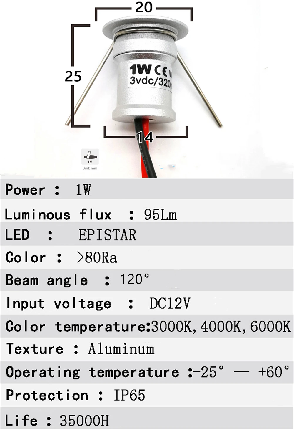 1. Материал: алюминий 2. Размер лампы: диаметр 20 мм, высота 25 мм, размер отверстия для резки: 15 мм 3. Вход: 100-240 В для адаптера (12 В для лампы) 4. Реальный Ватт: 1 Вт для одной лампы 5. Люмен: 95 лм для одной лампы 6. Цвет корпуса: серебристый 7. Светлый цвет: теплый белый/натуральный белый/холодный белый 8. Параметры контроллера управления: RF Control ler (может управлять лампой через стену или потолок) 9. Расстояние управления: 5-10 м 10. Питание для контроллера: 1 шт. 3 В литиевая батарея-CR2025 (не входит в комплект, пожалуйста, приобретайте в местном магазине.)