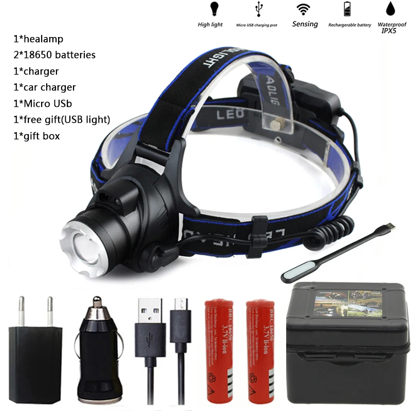 5000 люмен светодиодный налобный фонарь xml t6 xm-l2 фары фонарь 4 режима Водонепроницаемый налобный фонарь 18650 аккумуляторная батарея новейший