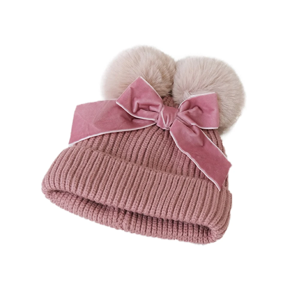 Детские вязаные теплые облегающие шапки для девочек, однотонные Мягкие Шапки с бантом и помпоном, шапки для маленьких девочек, шапки, милые аксессуары для детей
