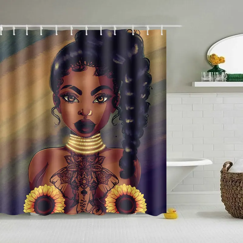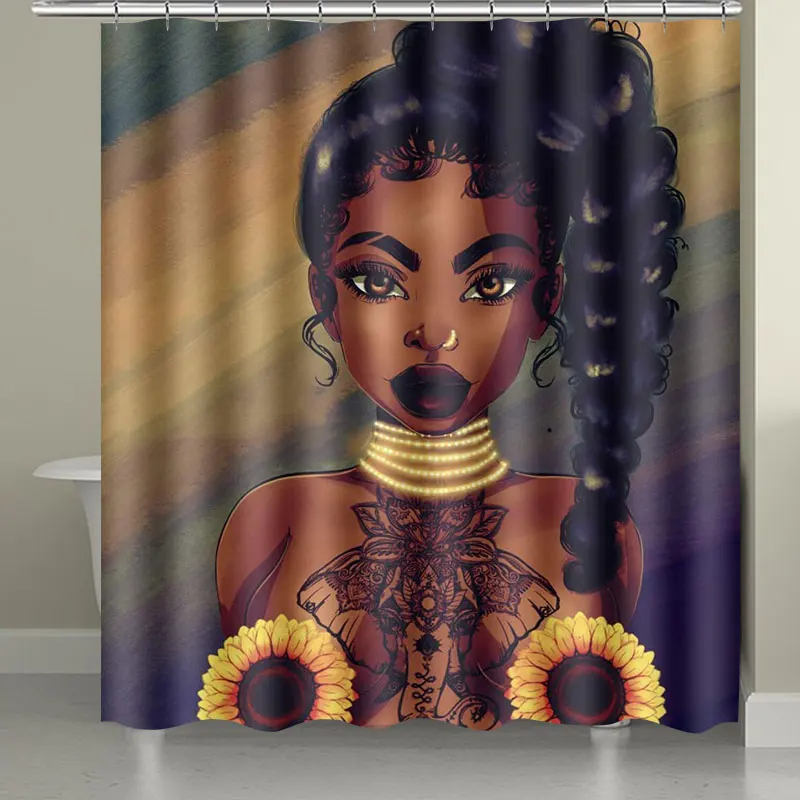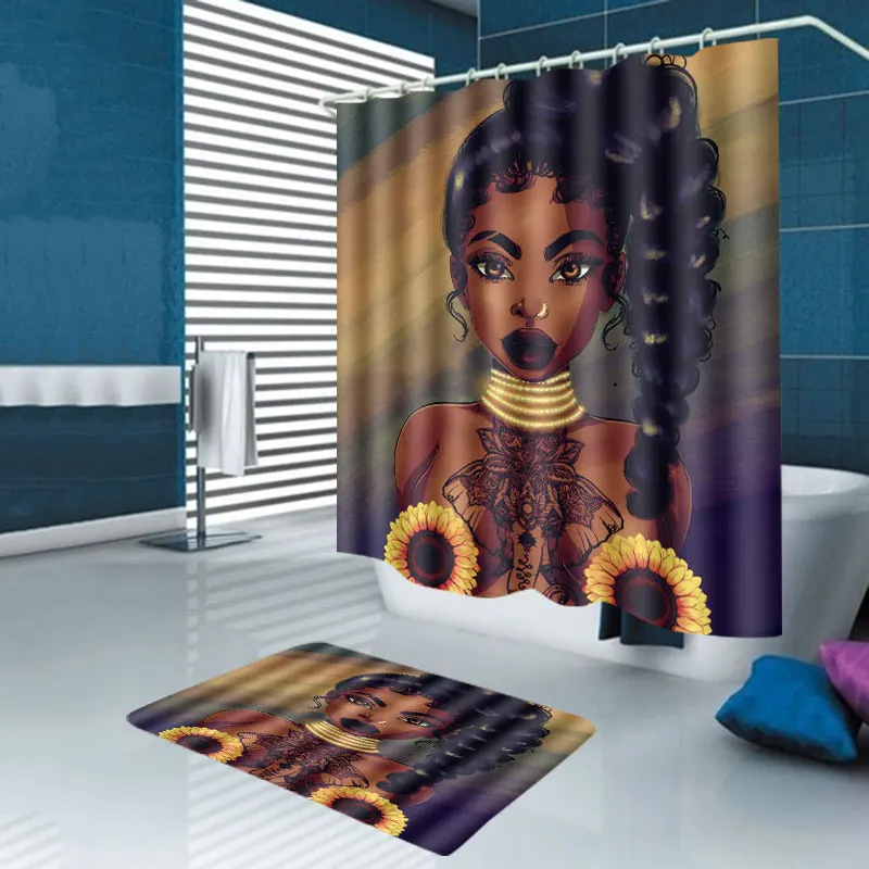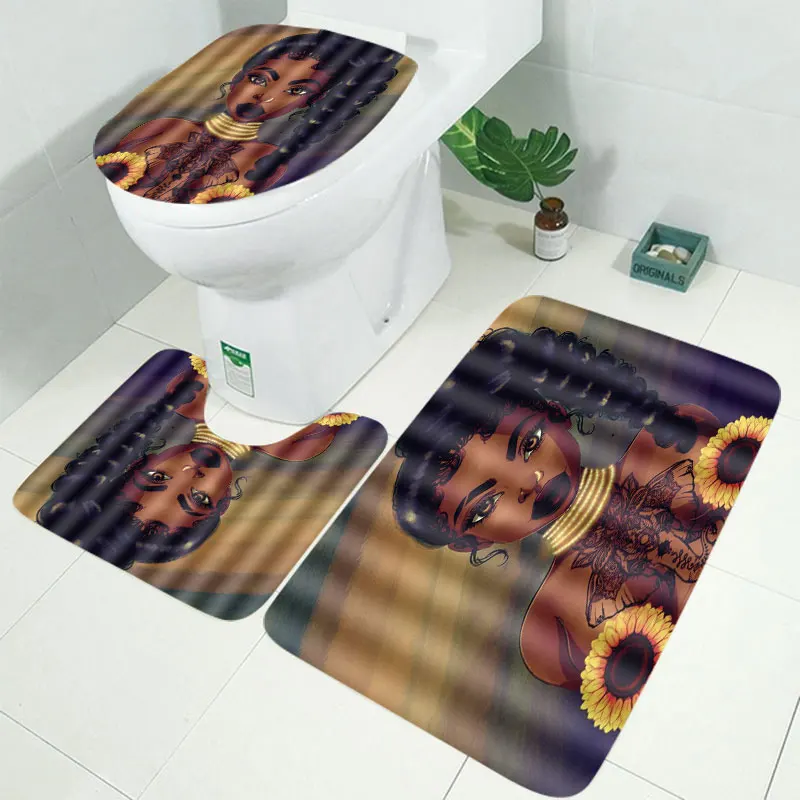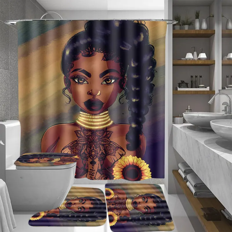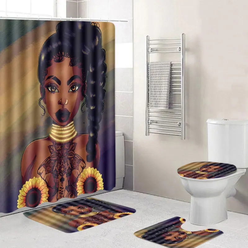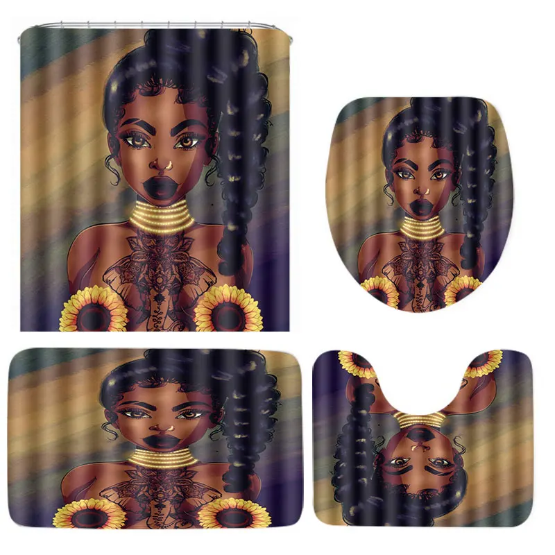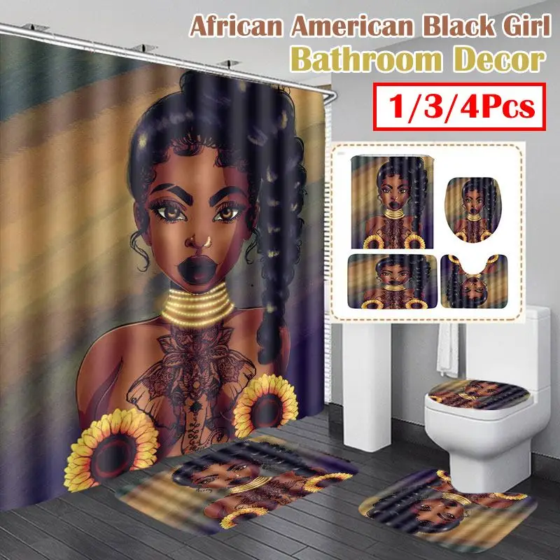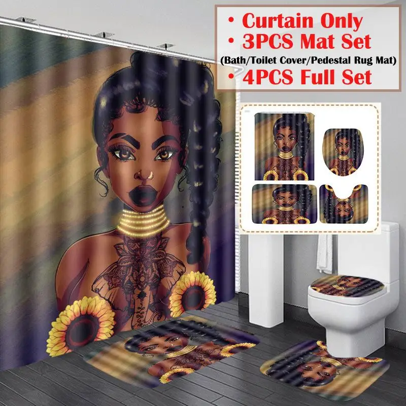 4pcsset African Black Woman Girl Bathroom Waterproof Shower Curtain Toilet Cover Pedestal Non Slip Rug Home Decor Set