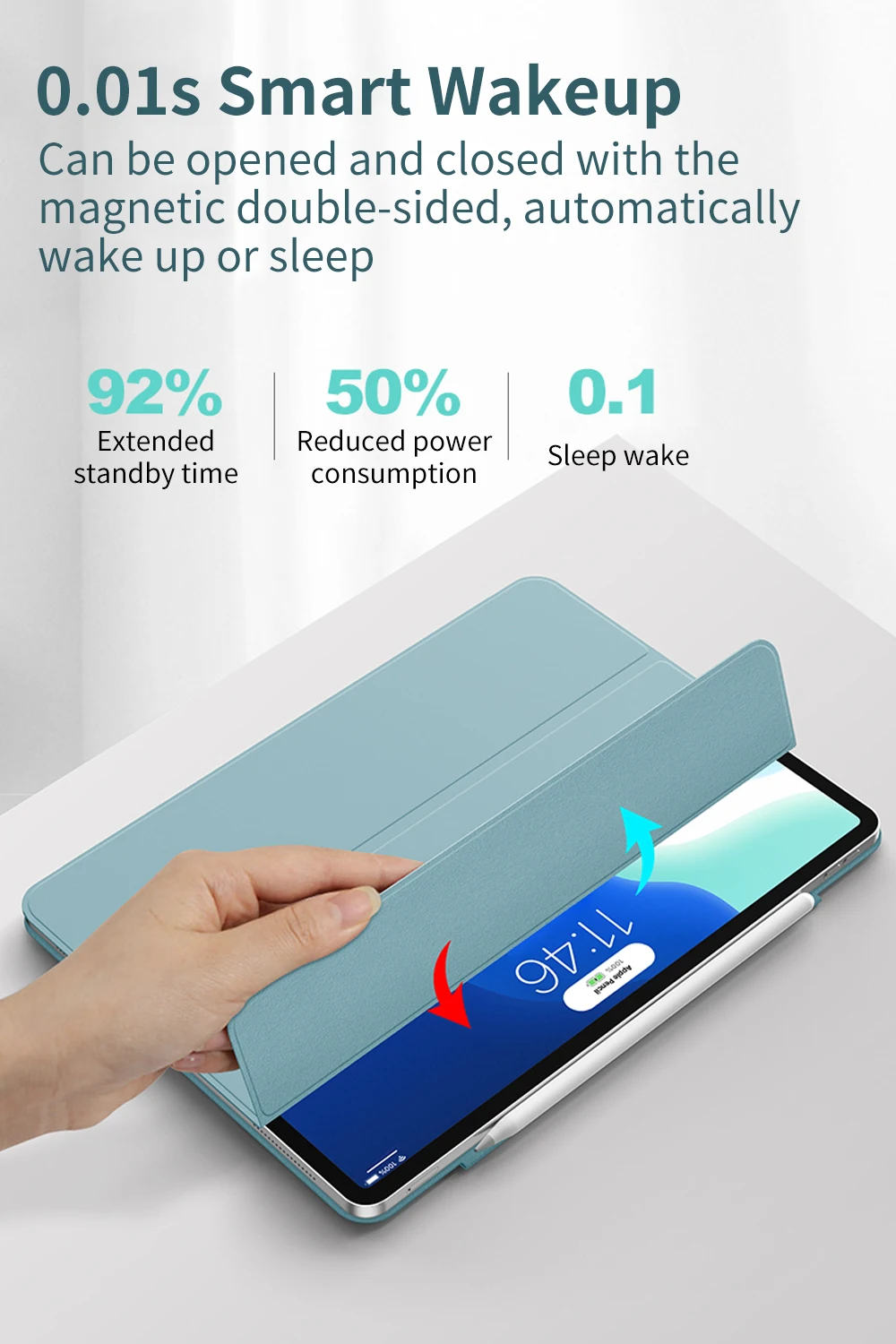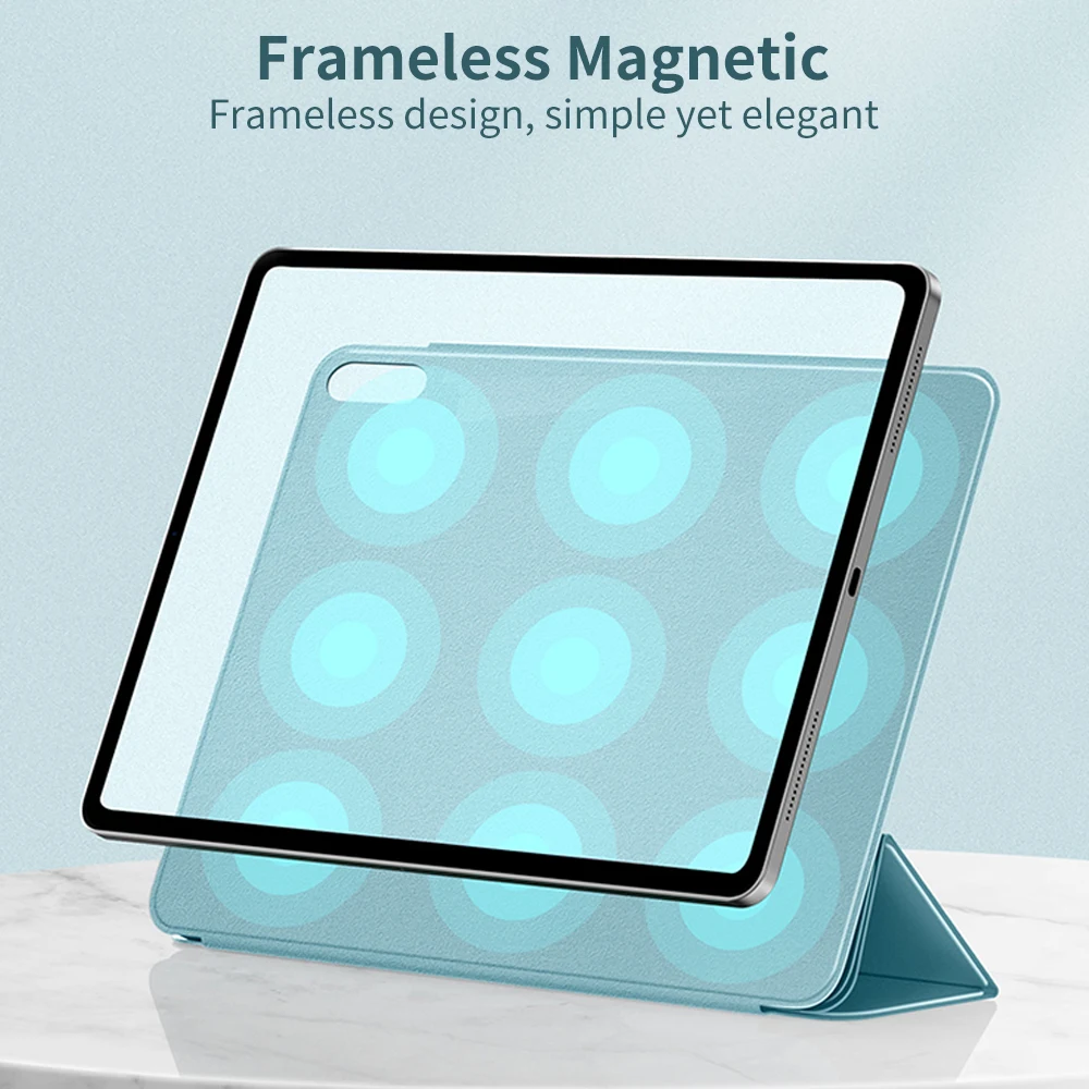 Очень красивый чехол для планшета, ощущается как матовая бархатистая поверхность, крепится на магните, закрывается без карандаша и с блокировкой, когда оснастки автоматически в режиме ожидания, при открытии дисплея экрана блокировки
