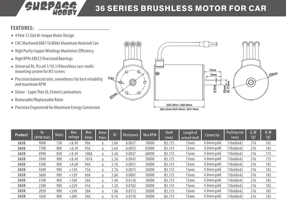 Водонепроницаемый бесщеточный двигатель 3650 1650KV 2050KV 2300KV 3100KV 3500KV 3900KV 4300KV 5200KV 5900KV для 110 RC Car багги-монстр