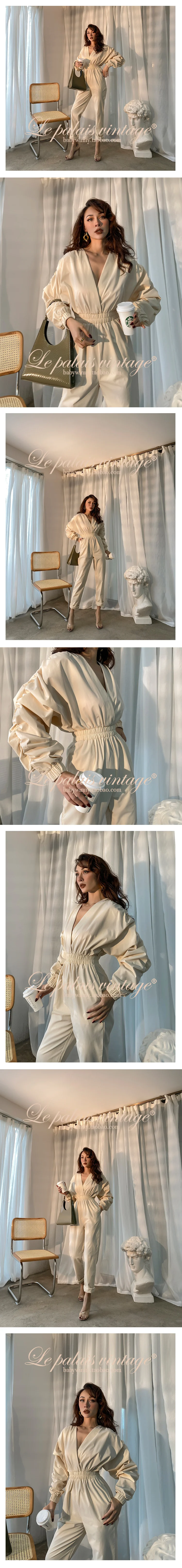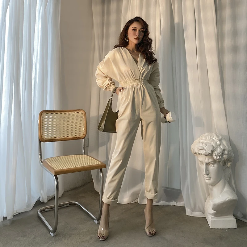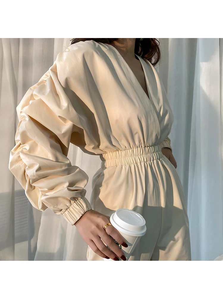 Осень 2020 Ins стиль плиссированные рукава летучая мышь эластичный Сбор талии бежевый белый комбинезон Свободный Повседневный Модный женский комбинезон с v-образным вырезом