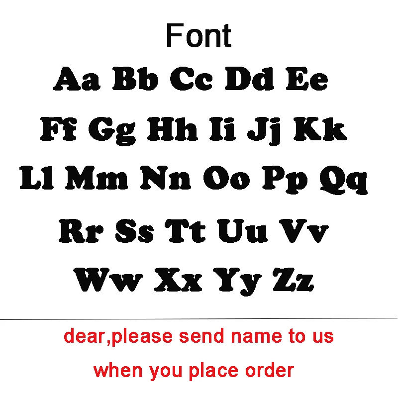 1. Дорогой, после того, как вы разместили заказ. Пожалуйста, пришлите нам имя, которое вы хотите настроить. И выберите тип шрифта, который вам нравится. (Например:Алиса, шрифт 2. ) Если вы не прислали нам понравившийся Вам шрифт, мы будем использоватьШрифт основного изображения. Надеюсь, вы понимаете