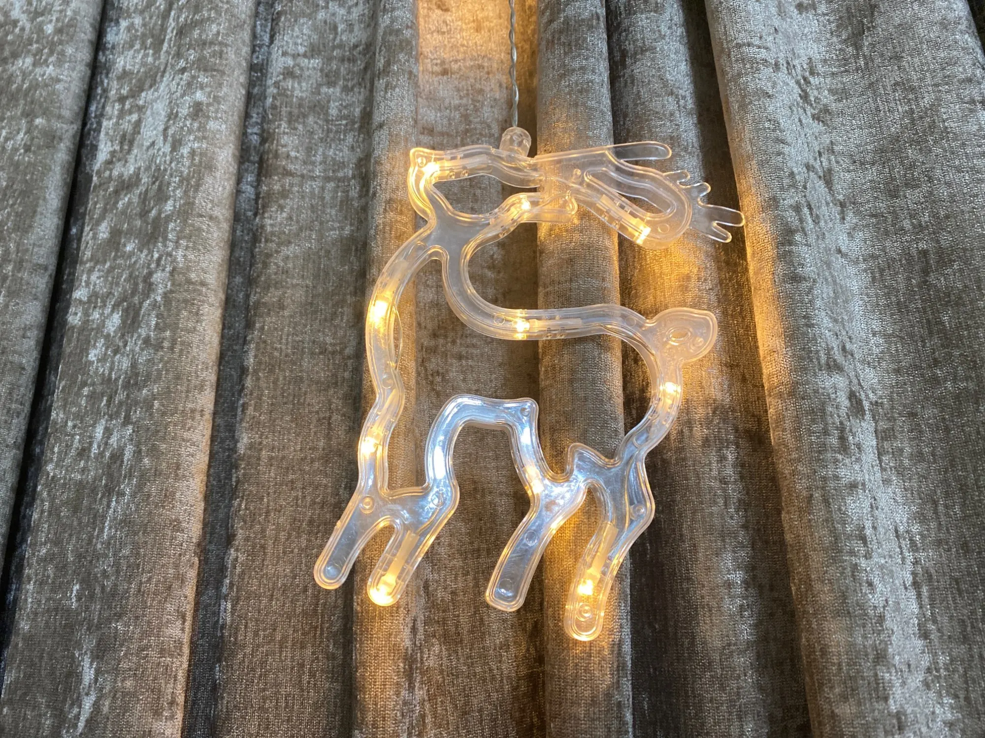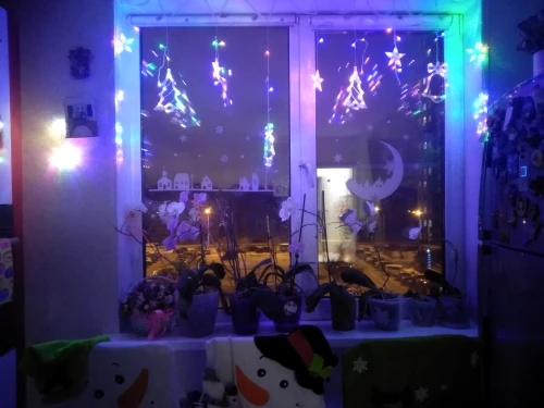 Красивая гирлянда, хорошо смотрится и снаружи и изнутри помещения. Продавец хорошо упаковал, но сама гирлянда изготовлена из ломкой, прозрачной пластмассы. Снежинка и олень были поломаны, заклеил клевым пистолетом. Почти незаметно, у продавца не просил скидку, поставил три звезды исключительно за очень быструю доставку.