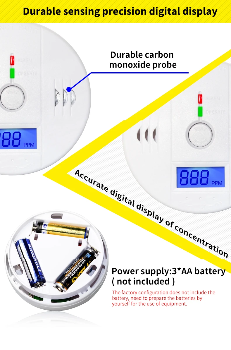 Chirp каждые 30s с зеленым светодиодный и Err на ЖК-дисплееМощность Потребляемая мощность: 0,3 МВтРазмер: 10x4 смПитание: 3 батарейки типа АА (не входят в комплект)Идеальный предмет для защиты вашей семьи от опасности угарного газаУлучшенный уровень защиты, легко читается с цифровым дисплеем, даже в условиях низкого уровня светильникОтображает уровень окиси углерода, Устройство воспринимаетЗеленый светодиодный индикатор: мигает каждые 30 секунд, указывая, что устройство работает должным образом. Зеленый светодиодный индикатор также мигнет до того, как ко-чтение будет снято и при нажатии любой кнопки.Красный светодиодный индикатор: при обнаружении опасного уровня угарного газа красный светодиодный индикатор начнет пульсировать, и будет звучать громкий сигнал тревоги. Сигнальная схема угарного газа-4 коротких звуковых сигнала, затем 5 секунд молчания, затем 4 коротких звуковых сигнала с соответствующей Красной светодиодный вспышкой. Этот цикл будет продолжать в течение 4 минут, а затем менять на 1 цикл каждую минуту, пока устройство не будет сброшено или CO не будет устранено.Кнопка тестирования/сброса предназначена для еженедельного тестирования, если он работает должным образомИ сбросить устройство во время CO alarmОповещает пользователей о необходимости замены батарейЭтот сигнал тревоги настоятельно рекомендуется установить на поверхность стеныКомпактный, легкий и простой в эксплуатации