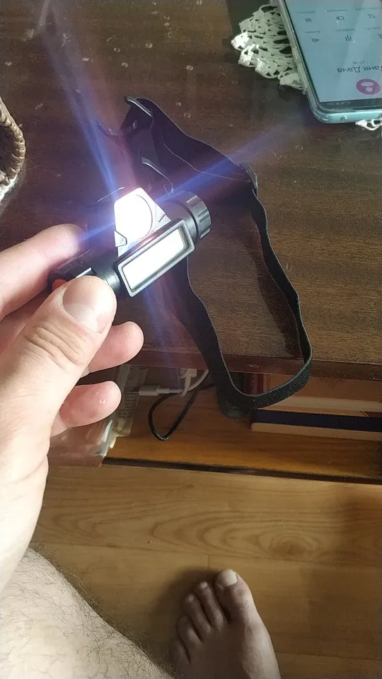 Отличный фонарик за эти деньги! Два режима имеет, на фото видно как светят оба режима, один рассеивающий свет даёт, второй дальний. Включается кнопкой сбоку. Заказал только фонарик, а продавец положил в подарок кабель для зарядки ещё! Очень приятно!