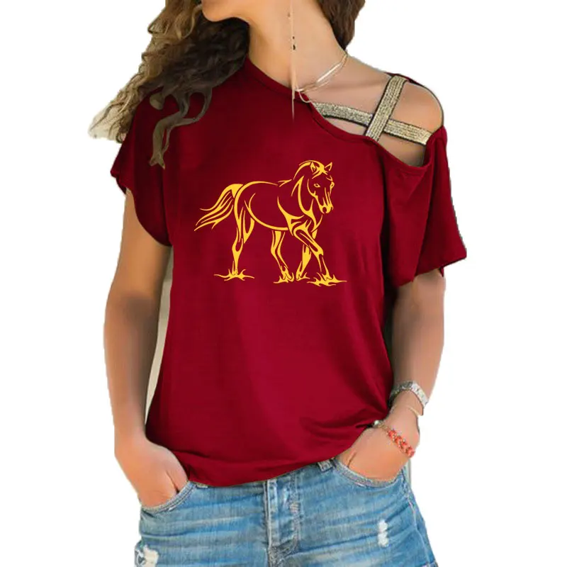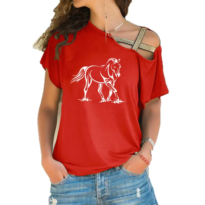 Креативная крутая женская футболка с принтом лошадей, Повседневная футболка с коротким рукавом для девочек, женские Асимметричные повязки с перекрещивающимися крестиками, топы, футболки