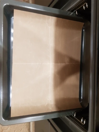 Классный коврик,готовлю на нем без масла,ничего не пригорает.Разрезала пополам его,по размеру получилось на 2 противня.Рекомендую...