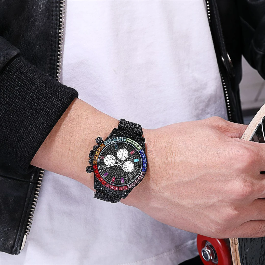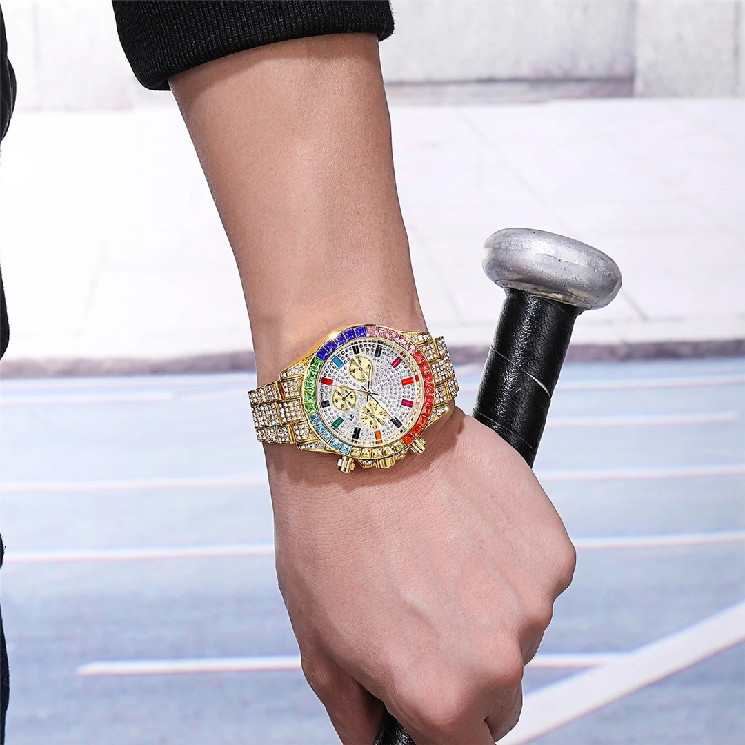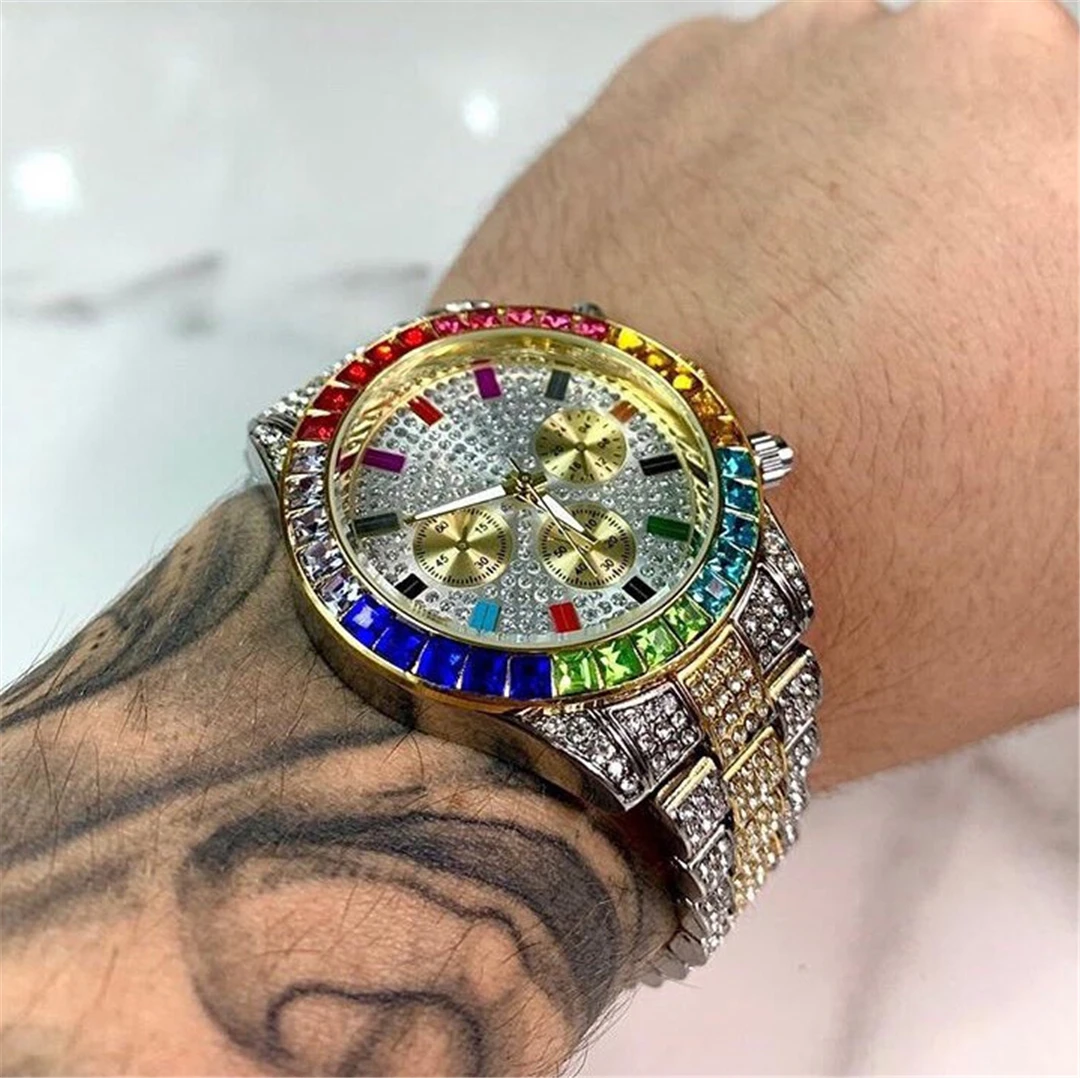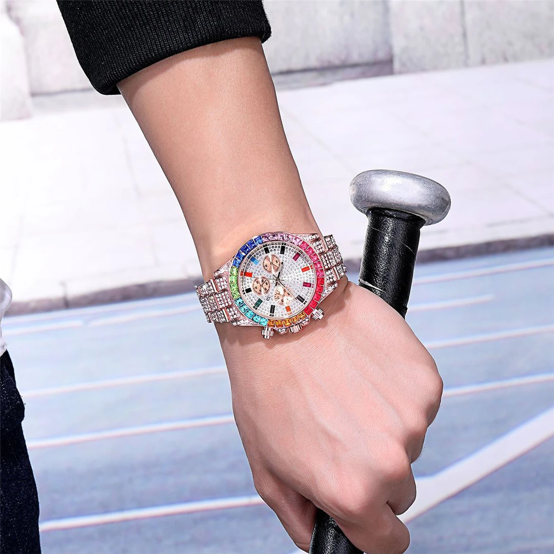 Часы наручные мужские кварцевые со стразами, роскошные, полностью стальные, унисекс, с календарем, роскошные