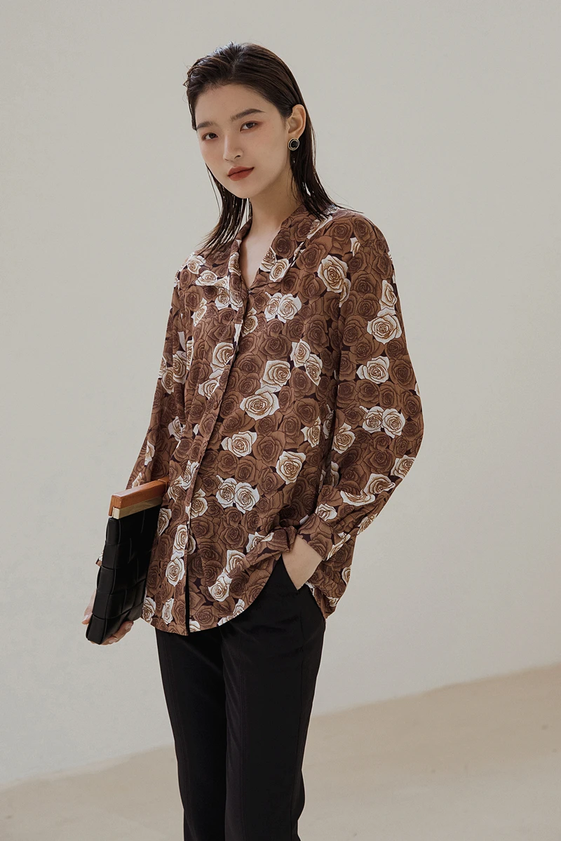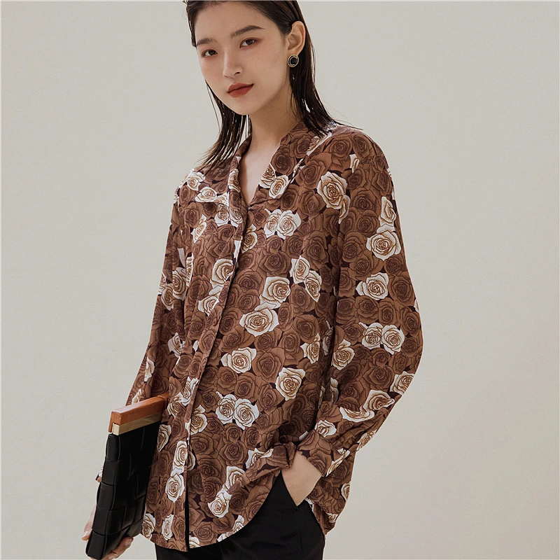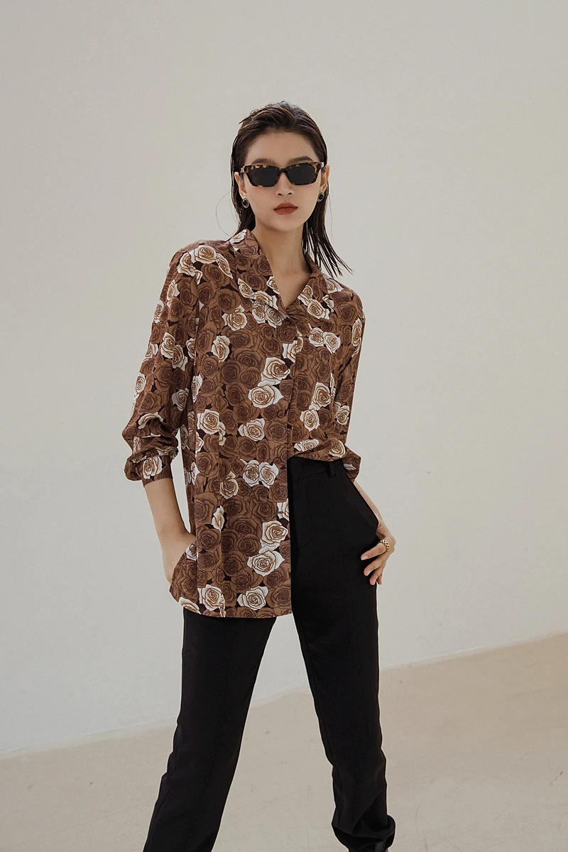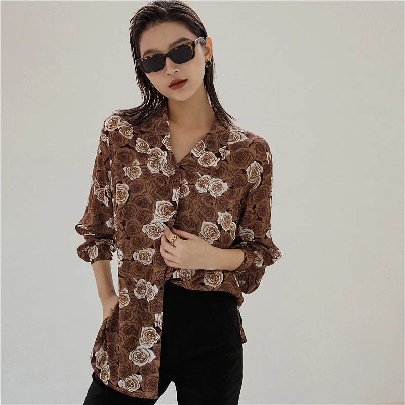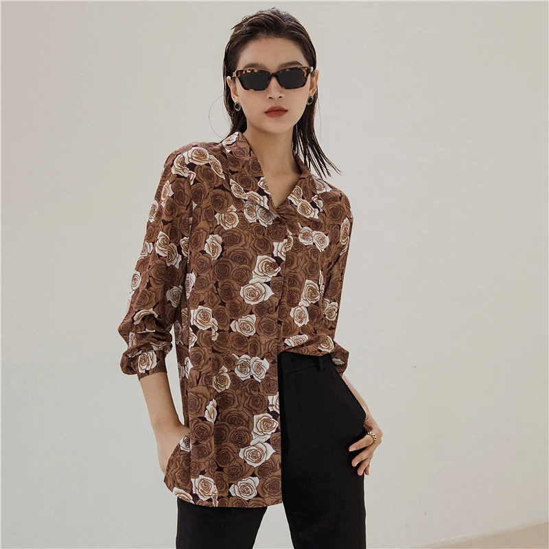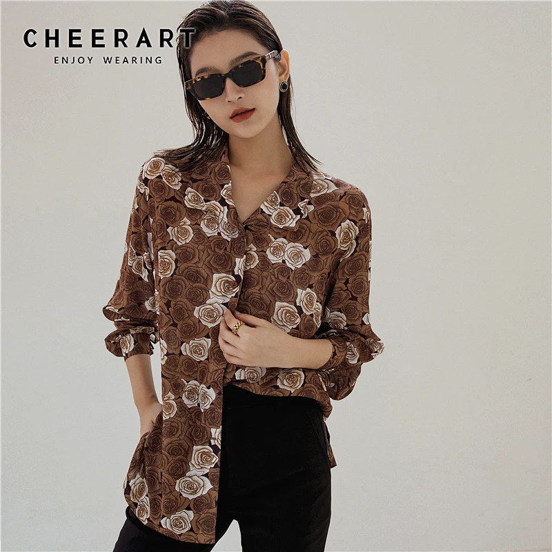 Осенняя коричневая рубашка CHEERART для женщин, Топ с длинным рукавом и блузка, свободная блузка с цветочным принтом роз, рубашка с воротником на пуговицах, одежда