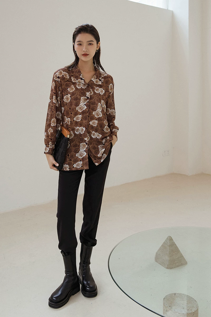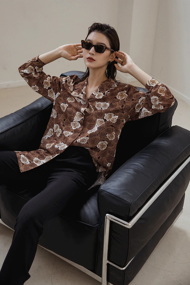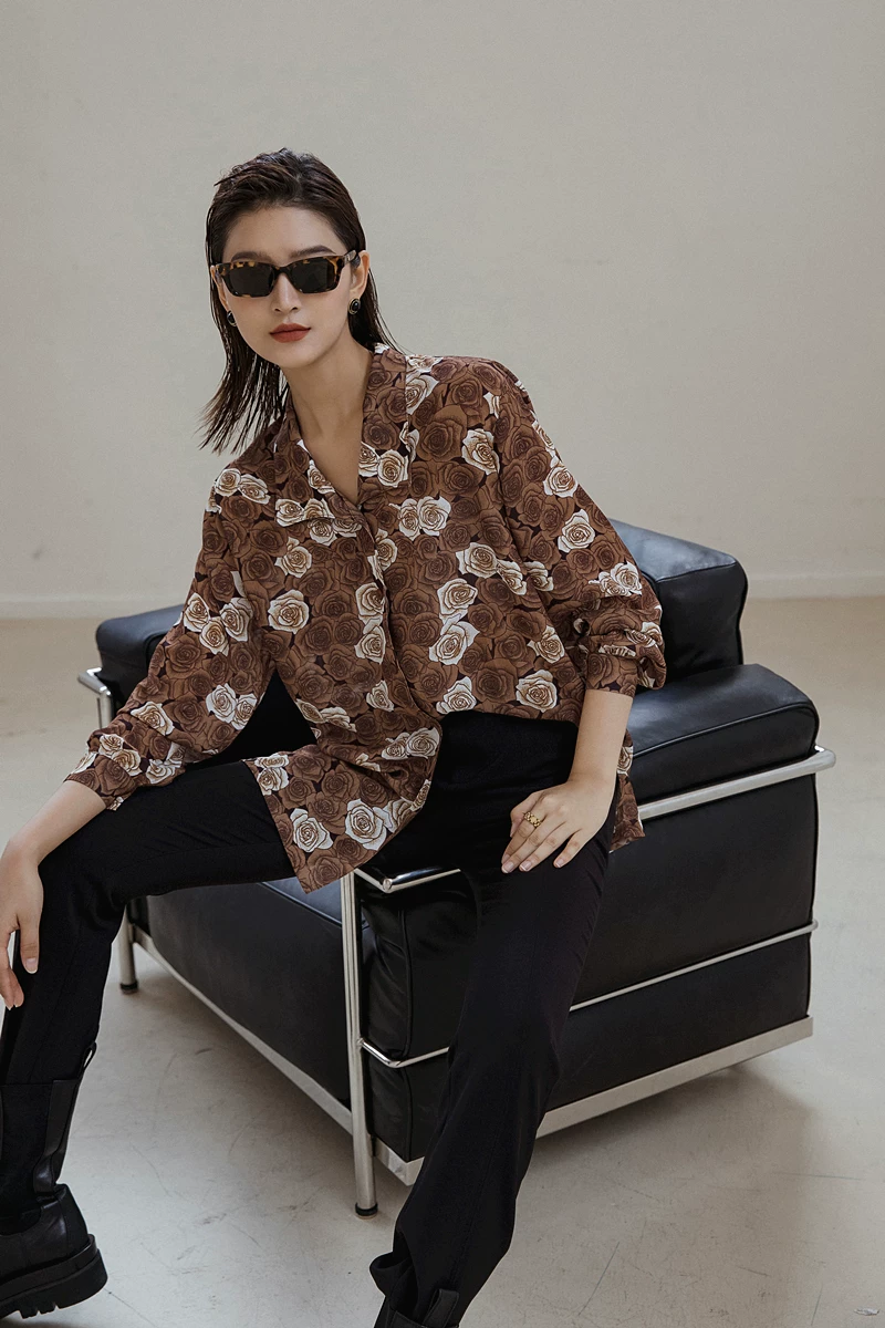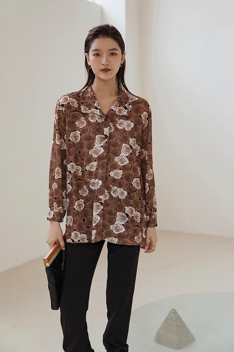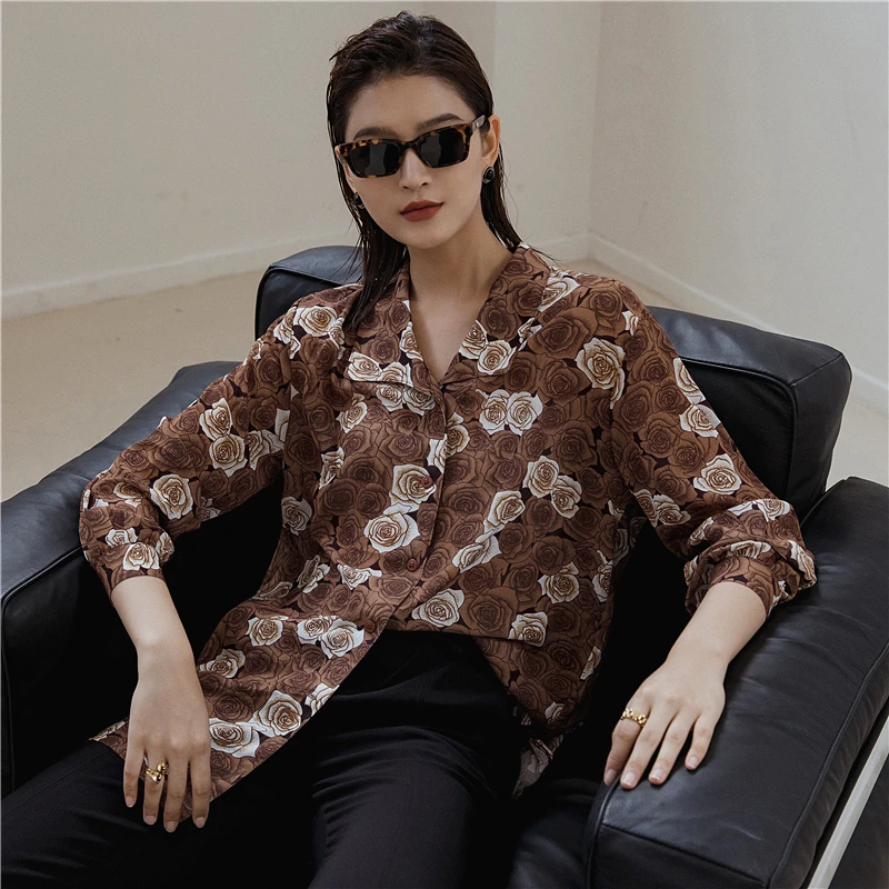Осенняя коричневая рубашка CHEERART для женщин, Топ с длинным рукавом и блузка, свободная блузка с цветочным принтом роз, рубашка с воротником на пуговицах, одежда
