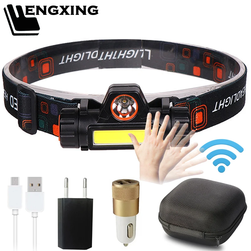 Портативный налобный фонарь с датчиком XP-G, мини-фонарик, 2 светильника, светодиодный налобный фонарь COB, Встроенный USB-аккумулятор 18650, костюм для рыбалки