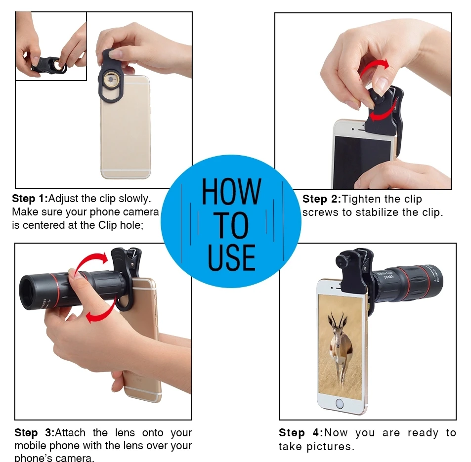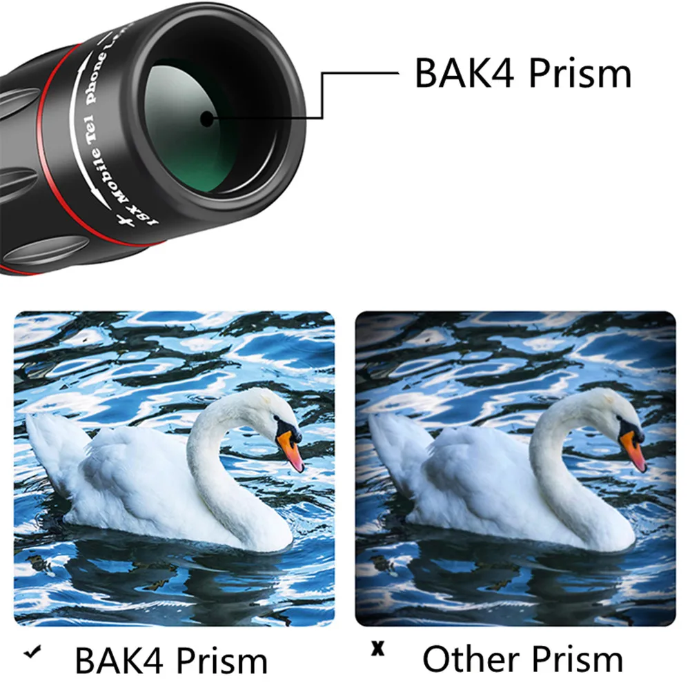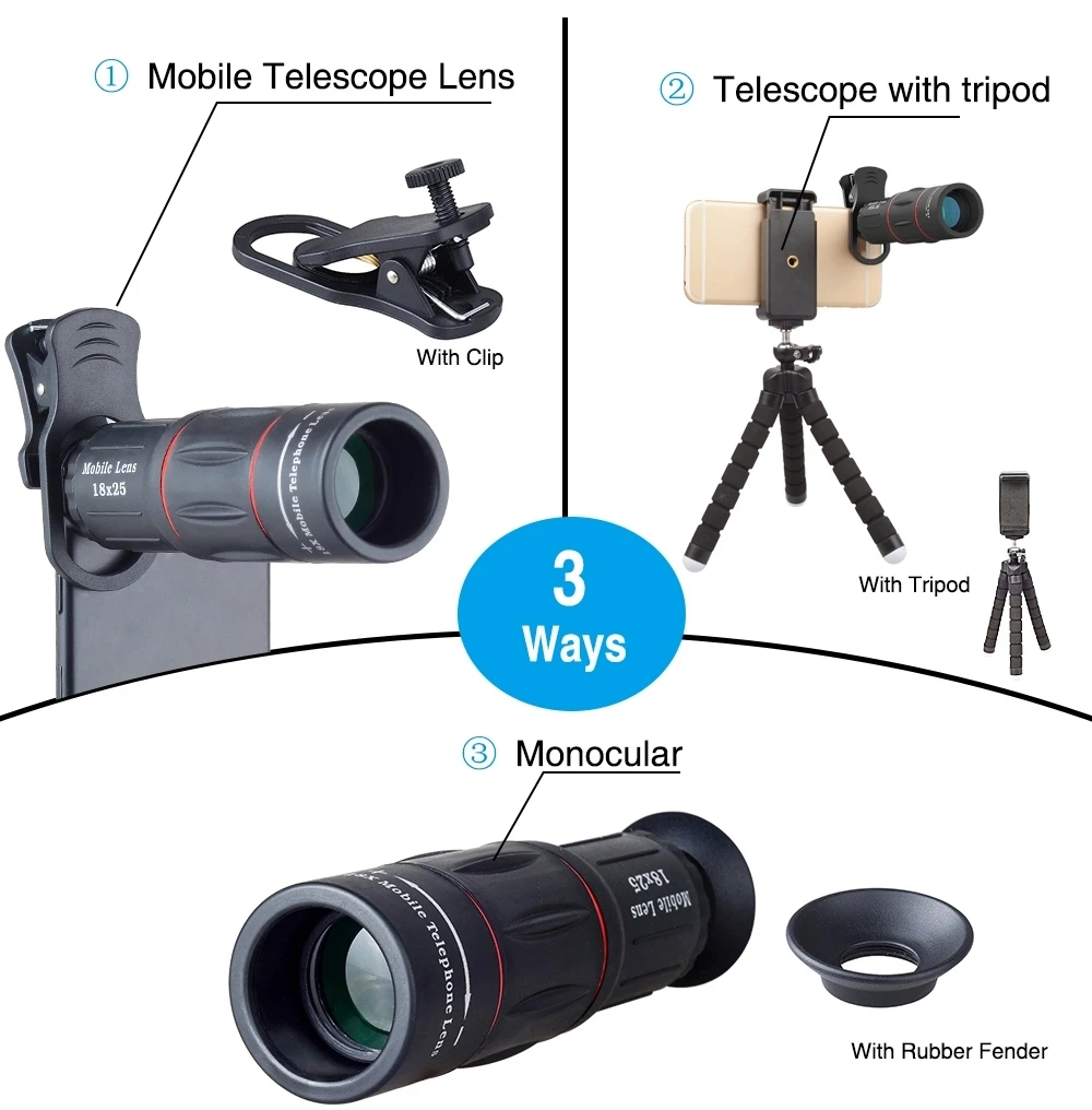 Особенности:* 8 в 1 дизайн: профессиональный объектив камеры комплект включает в себя 18x телеобъективы, 0.63x широкоугольный объектив, 15x макро объектив, 198 ° Объектив рыбий глаз, 6 калейдоскоп, 4-строчный звездных фильтров, дистанционный спуск затвора и штатив* Телескоп имеет 18 кратное увеличение, с помощью которой можно регулировать фокусное расстояние хорошо.* Телескоп можно использовать как монокуляр.* Подходит для большинства мобильных телефонов, включая флип-телефоны и бар-телефоны, телефон имеет заднюю камеру, может быть подключен к телескопу через зажим.* Подходит для просмотра игры, концертов, туризма, наблюдения за животными, съемки на дальние расстояния и т. Д.* Частный детектив фотографирует Судмедэксперты, геологоразведочные работы,Управление лесным хозяйством, планирование железнодорожных портов и т. Д.* Штатив съемный, ножки могут быть разделены и произвольно искажены. Он более крепкий и легко крепится в любом месте. Изгиб и поворот на 360 ° для формирования идеальной формы* Универсальный зажим для объектива: уникальный зажим, совместимый с большинством смартфонов и мобильных устройств, включая iPhone 8/x 7/7 Plus 6S/6S Plus/6, samsunggalaxy S8 S7 S6, iPad, планшет и большинство смартфоновСпецификация:Телефото/МонокулярMaganification: 18xВид поля: прибл. 1000 м/3280ftРазмеры: 5x1,5x1,5 дюймовШирокоугольный объективШирокоугольный объектив может снимать больше пейзажей. Например, Длинные Городские пейзажи и большие групповые снимкиУвеличение: 0,63xКонструкция линз: 2 элемента в 2 группахМаксимальный диаметр: 20 ммПримечание: При съемке фотографий рекомендуется использовать широкоугольный объектив в широкой открытой местности, чтобы получить лучшие фотографии.Объектив рыбий глазБольшая сцена может быть захвачена линзой рыбий глаз, дайте вашим изображениям круглый эффект рыбьей чаши. Который перенесет вас в потрясающий фантастический мир.Поле обзора угла: 198 °Конструкция линз: 3 элемента в 3 группахМаксимальный диаметр: 25 ммПримечание: Убедитесь, что объектив регулируется прямо перед объективом камеры вашего смартфона, избегая некоторых размытых фотографий.МакрообъективМакрообъектив может делать четкие фотографии небольших объектов.Увеличение: 15xКонструкция объектива: 1 элемент в 1 группеМаксимальный диаметр: 20 ммПримечание: чтобы получить потрясающий эффект при использовании этого макрообъектива, вам нужно разместить прозрачную крышку на поверхности объекта, который вы хотите снять, убедитесь, что вы не блокируете светильник и держите на расстоянии 2-3 см от объекта съемки.Гибкий штатив1. Полная гибкость, изготовлен из жесткого пластика и алюминия, ноги могут быть разделены и произвольно искажены.2. Соединительные винты в большинство размеров цифровой камеры и съемные3. Вращение на 360 °, вы можете использовать его в любом случае вам нравится4. Съемное соединение с кнопкой блокировкиПосылка включает:1 x 18X Мобильный телеобъектив1x3 в 1 комплект объектива камеры1 х Bluetooth затвор2 x зажим1 х гибкий штатив1 черный чехол1 х Салфетка для очистки1 x Розничная коробкаПримечание:1. Пожалуйста, используйте его осторожно, потому что линзы отрегулированы точно, если он падает или ударяется, поле зрения может не совпадать, и изображение будет отклоняться2. Макрообъектив и широкоугольный объектив крепятся вместе во время получения. При использовании широкоугольного объ