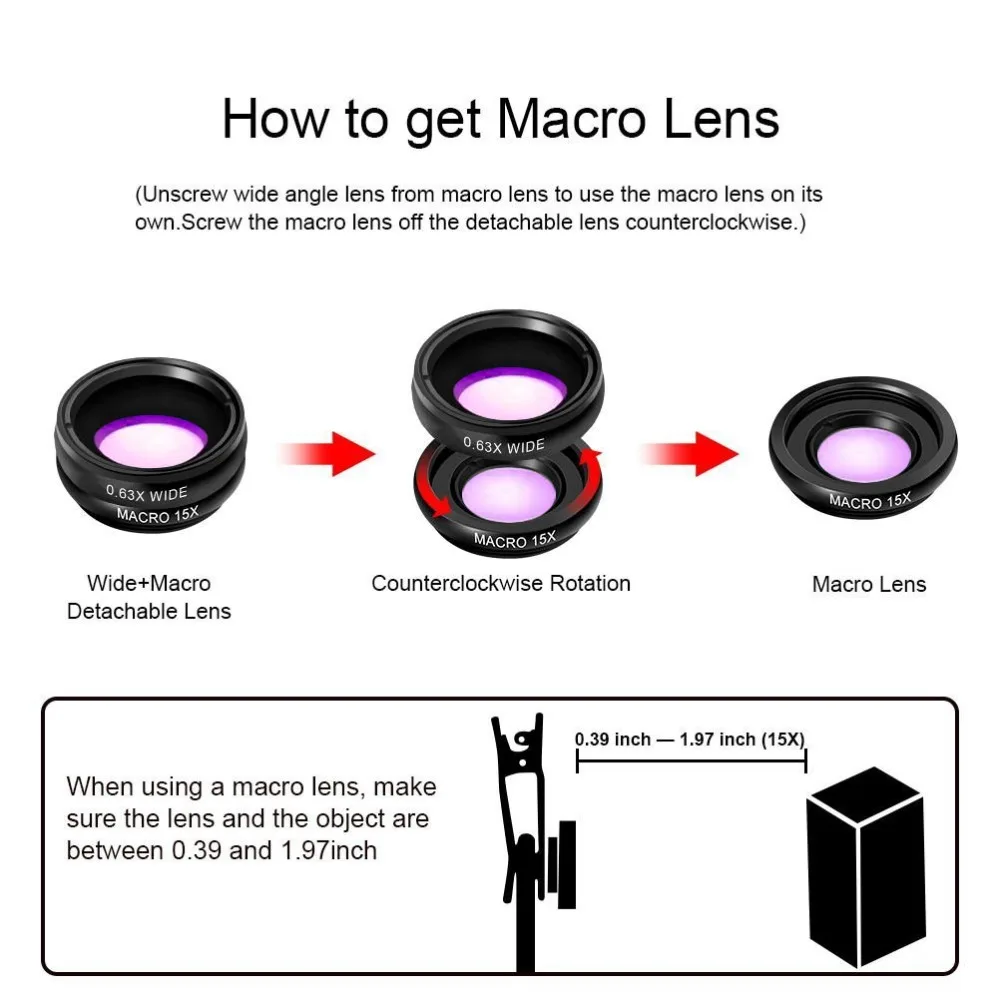 Примечание: Когда вы получаете объектив, широкоугольный объектив и макрообъектив соединены вместе, вы можете отвинтить его, чтобы получить один широкий угол и один макрообъектив.