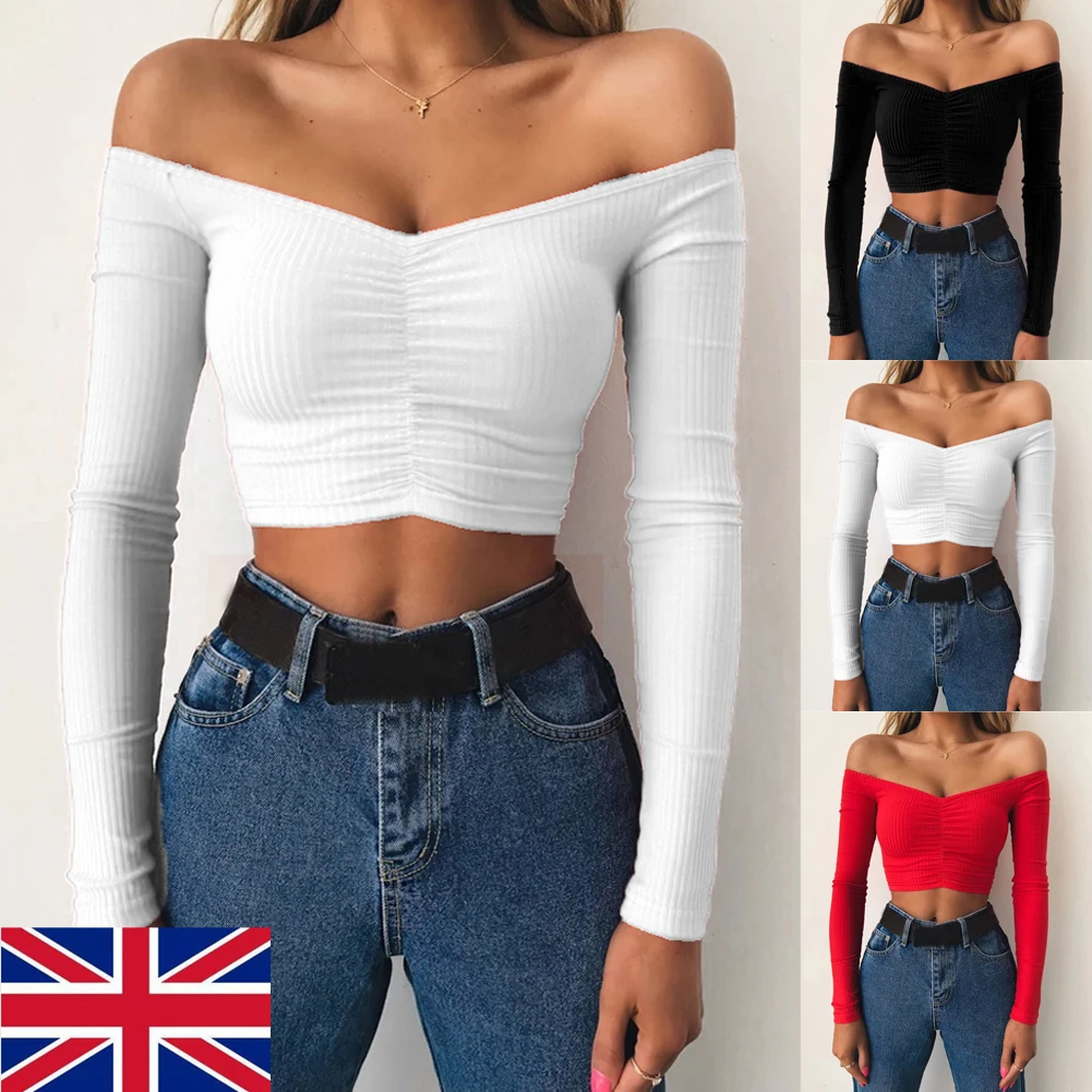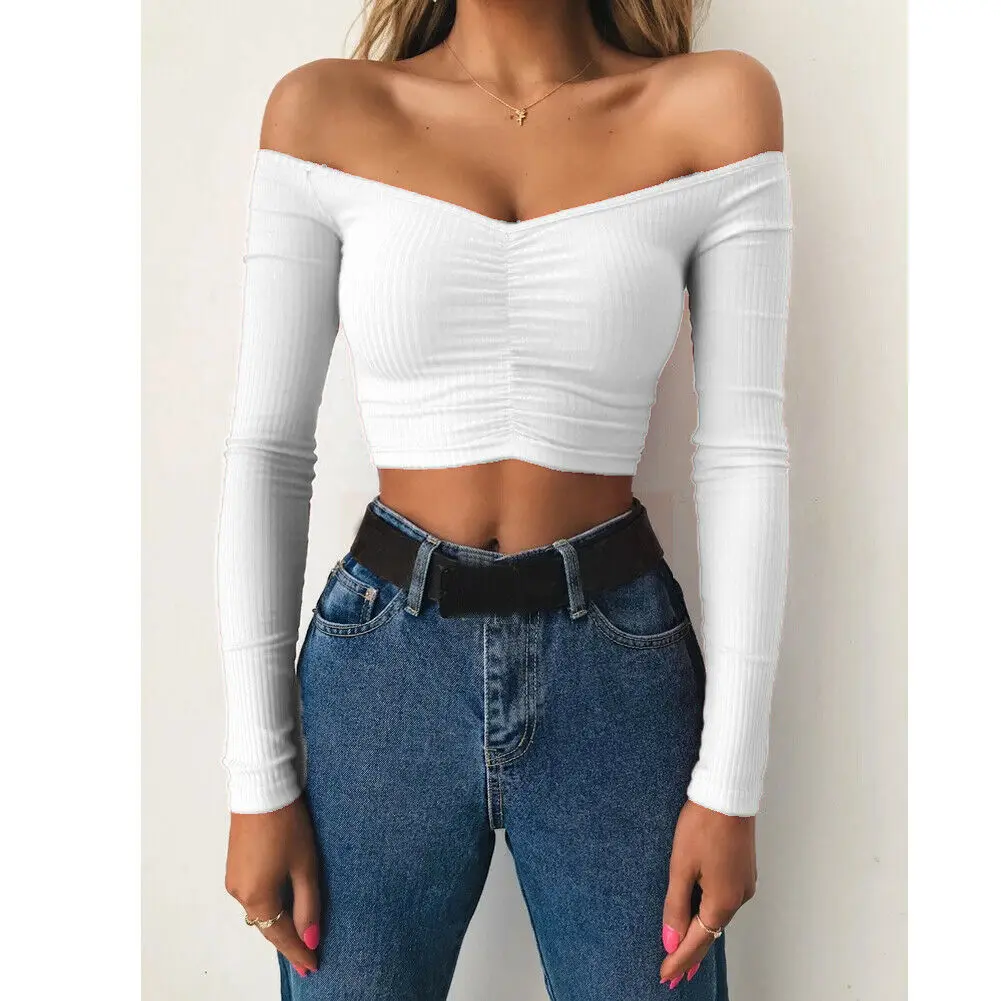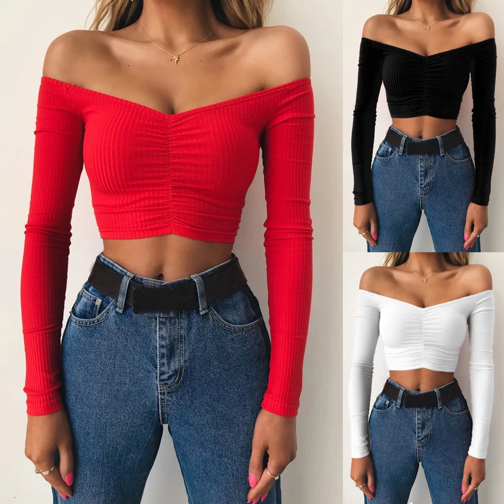 Женская футболка с открытыми плечами, повседневный облегающий пуловер с длинным рукавом, лето-осень