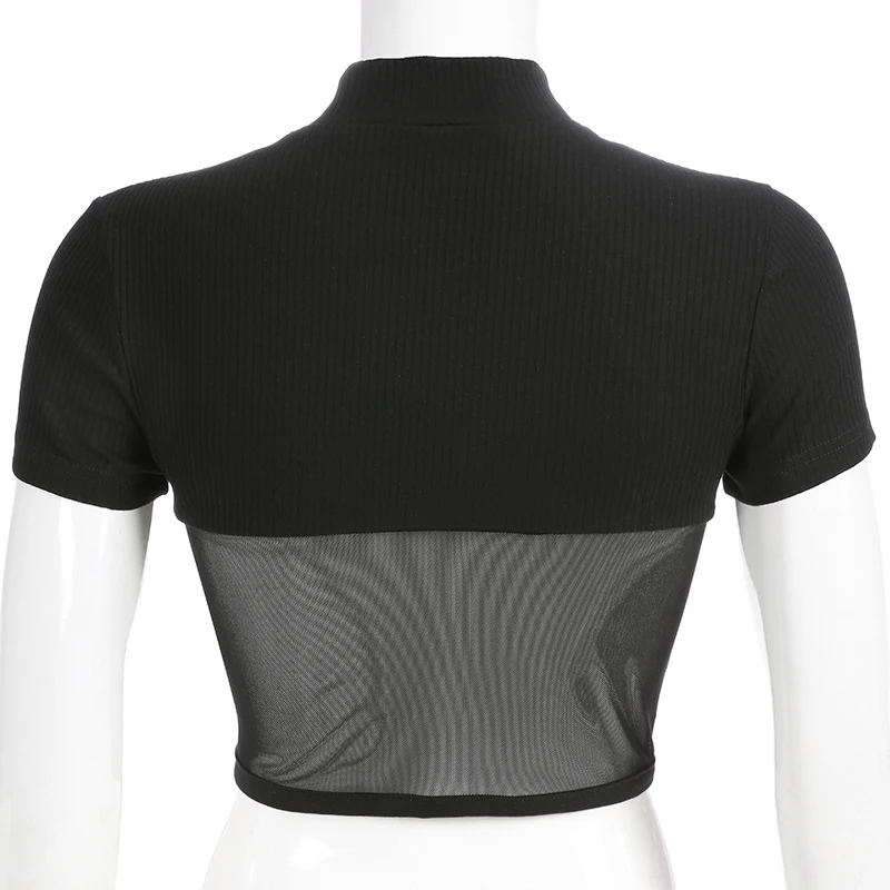 Летняя уличная одежда, рубашка с коротким рукавом, женский черный сетчатый патч-майки, укороченный топ, Женская Клубная одежда, облегающий Топ