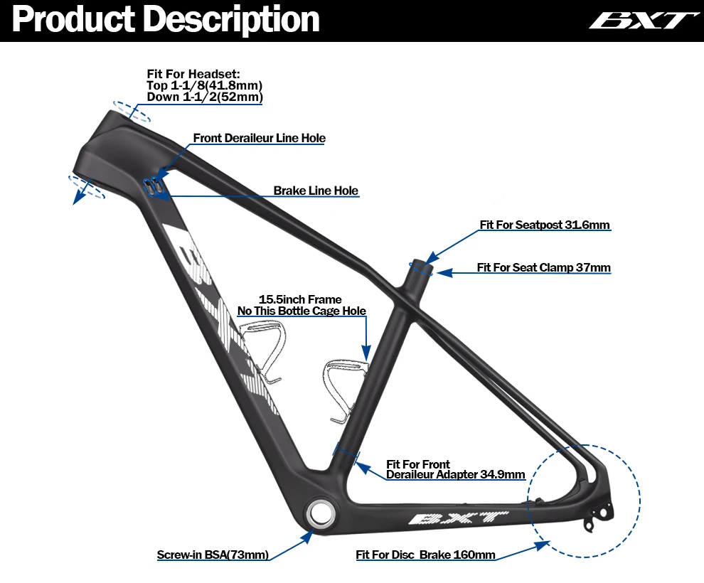 Тип: углеродная рама для горного велосипеда с диском эр;Материал: углеродное волокно T1000;Подходит для зажима сиденья: 37 мм;Подходит для адаптера переднего переключателя: 34,9 мм;Подходит для подседельного штыря: 31,6 мм;Максимальная нагрузка: 150 кг;Подходит для шин: 2,3, макс.;Подходит для дискового тормоза: 160 мм;Подходит для нижнего кронштейна: вкручиваемый BSA(73 мм);Подходит для вилки: 80-100 мм;Подходит для ступицы: 135x9 мм или 142x12 мм;Подходит для гарнитуры: коническая; Верхняя часть 1-1/8 (41,8 мм) вниз 1-1/2(52 мм);Тормоз, трос переключателя: внутренняя рама;В заказ входит: рамка + адаптер + зажим сиденья + задний крючок;