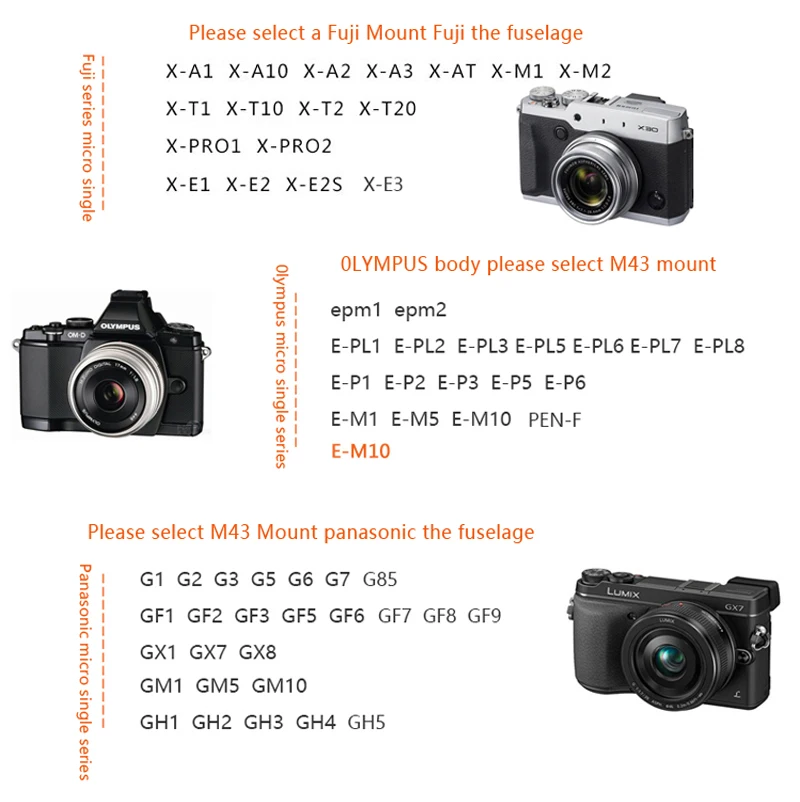 Изысканный внешний вид объектива отлично подходит для камер Sony, Fujifilm, Canon и других беззеркальных камер. При покупке, пожалуйста, обратите внимание на модели Canon: Canon M1, M2, M3, M5, M6, M10 и M100 приблизительно для небольшой микро-однокамерной камеры, Canon SLR не может использоваться для установки.