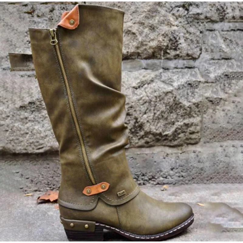 Женские ботинки до середины икры, винтажные британские БОТИНКИ из искусственной кожи, женская обувь на низком каблуке с застежкой-молнией, женские модные длинные ботинки в стиле ретро, 2020