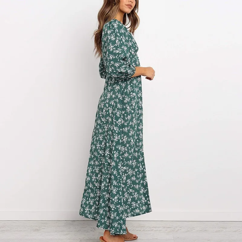 Осеннее цветочное длинное платье, женская одежда, модное элегантное женское платье миди с V-образным вырезом и длинным рукавом в стиле бохо, повседневное зеленое платье большого размера