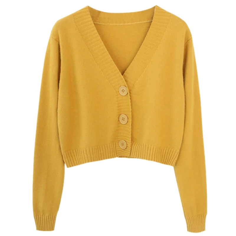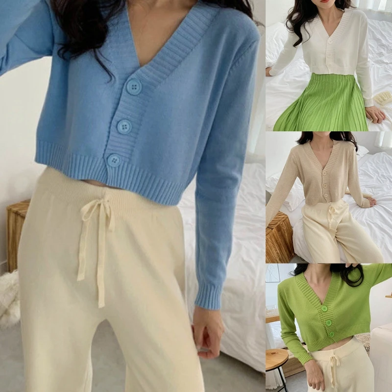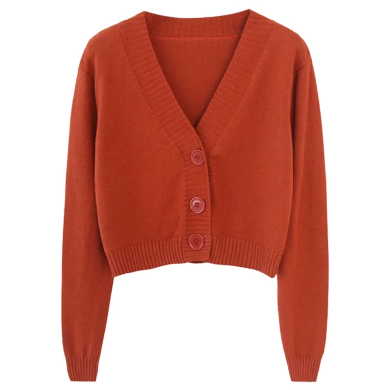 Женский свитер с длинным рукавом, кардиган с V-образным вырезом, укороченная куртка на пуговицах, милая однотонная свободная вязаная куртка карамельных цветов