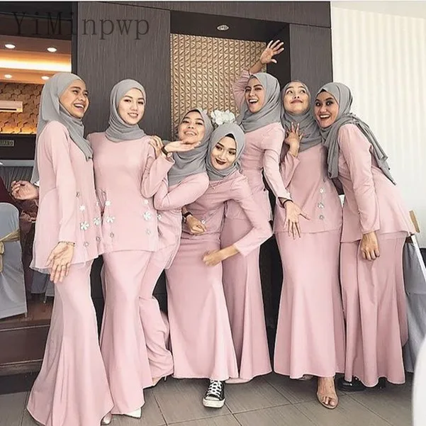 Мусульманское розовое платье подружки невесты с О-образным вырезом и длинным рукавом
