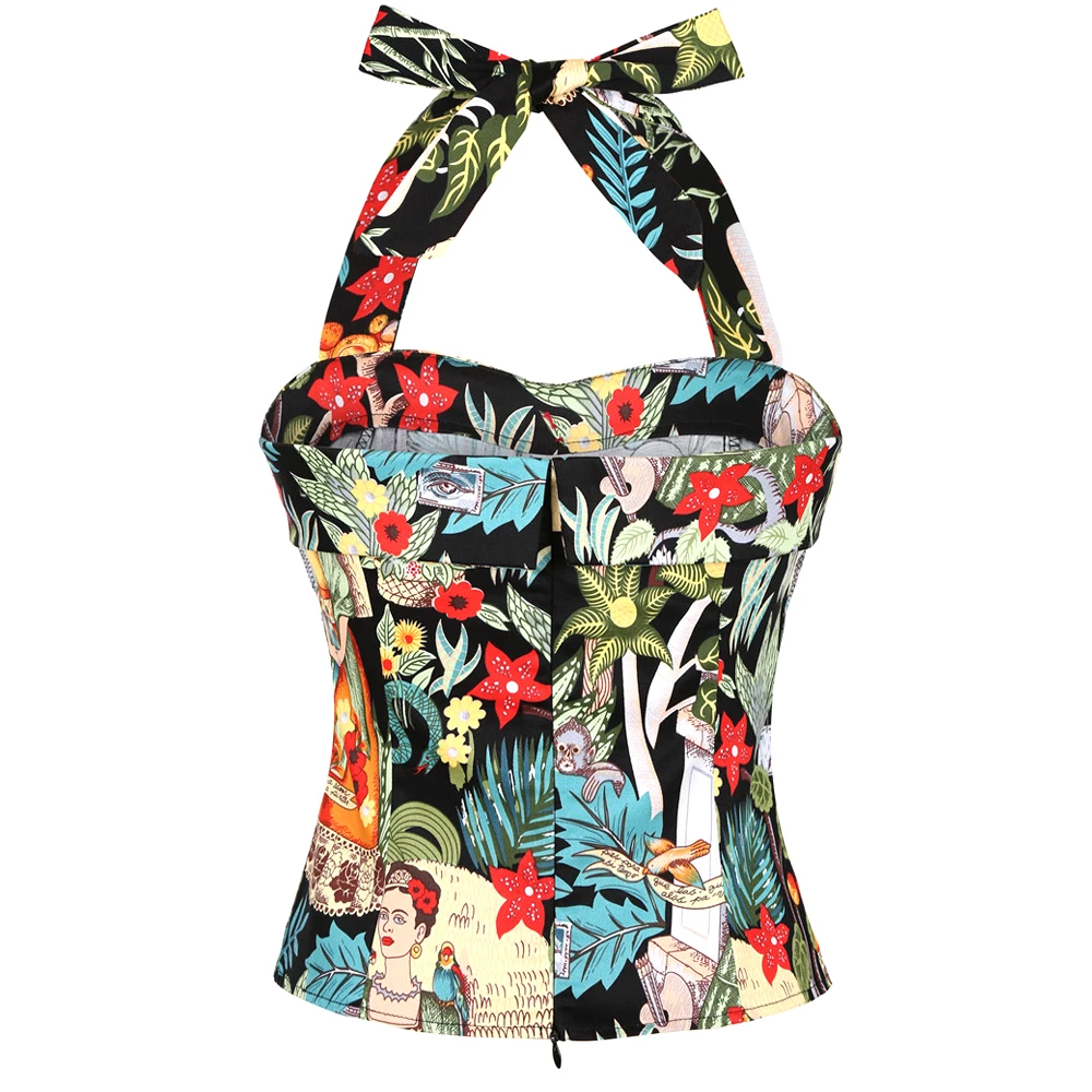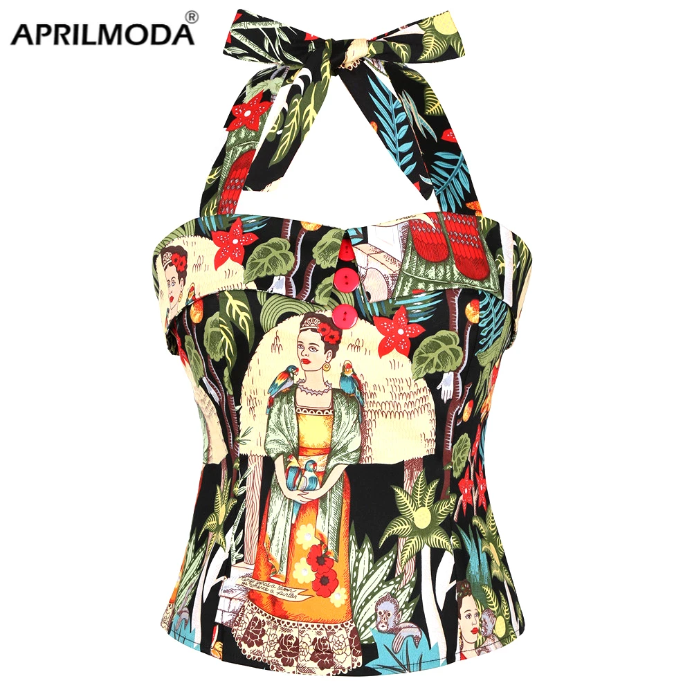 2022 женские рубашки ретро Винтаж 50s 60s цветочный принт без рукавов Холтер тонкие блузки Модные женские рокабилли Pin Up Топы