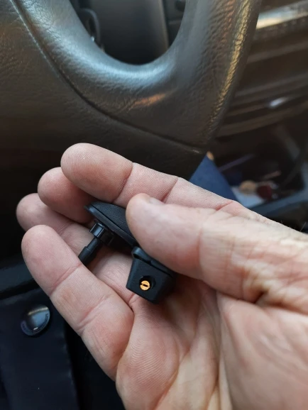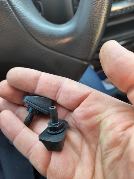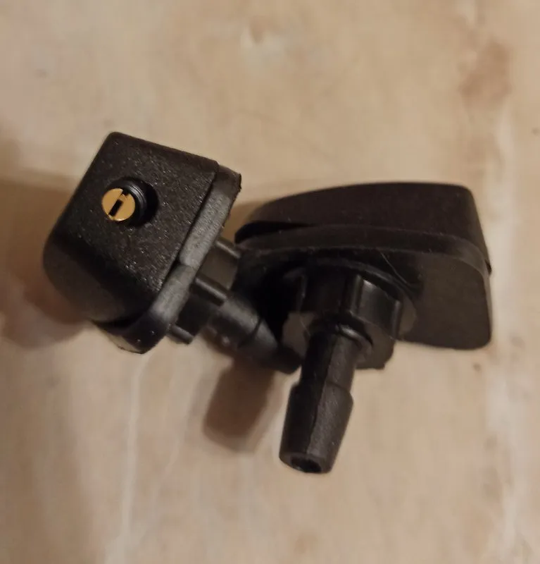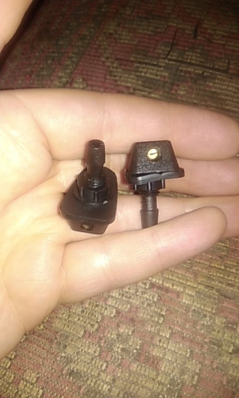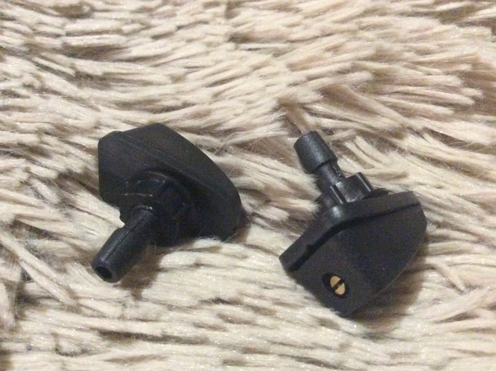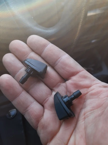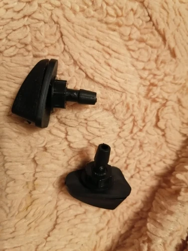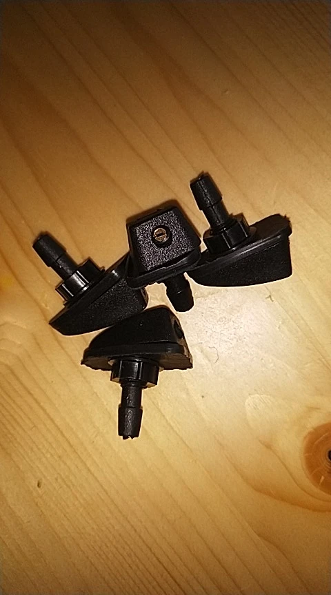 Фиксируются пластиковой гайкой через резиновый уплотнитель в форме нижней части омывателя. Выглядит хорошо, с приходом тепла будет установлено взамен штатных омывателей.