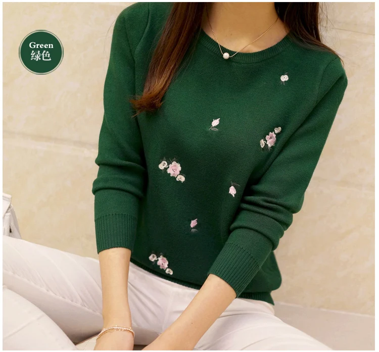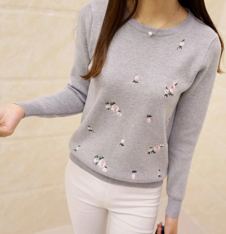 Свитер женский хлопковый однотонный, с цветочной вышивкой и длинным рукавом, Повседневный, 2020