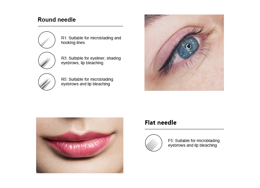 1. 10 Минут Быстрого пму полного затенения губ и контура. Лечение, 1 минута перманентной подводки для глаз.2. Острый одноразовый наконечник иглы картриджа, меньше боли.3. Цвет достигает 95% После заживления.4. Естественный Перманентный макияж результат после заживления.5. Подходит для микроблейдинга бровей, затенения, губ, подводки для глаз, микроиглы и сальпигментации.6. В9 штифтов и В12 штифтов для инсульта волос, микроблейдинга, затенения.7.Meso-12 и Meso-9 /36/42 игла для средств по уходу за кожей.8. Подходит для цифровой микропигментационной машины бренда Msstor и новейшего портативного набора pmu pem.