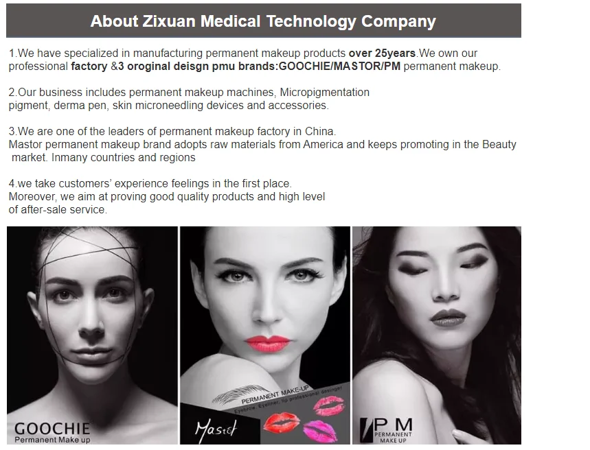 Mastor является брендом под названием компании Zixuan. Его стандартизация продукции, квалификация качества, технические инновации и т. Д. Разрушили традиционный сегмент рынка. И рабочая техника имеет крупный прорыв, который принесет больше преимуществ традиционным ручным вышивальным пером, микролезвиями, пастой пигментом, что позволяет полностью улучшить технику постоянного макияжа для учителей.