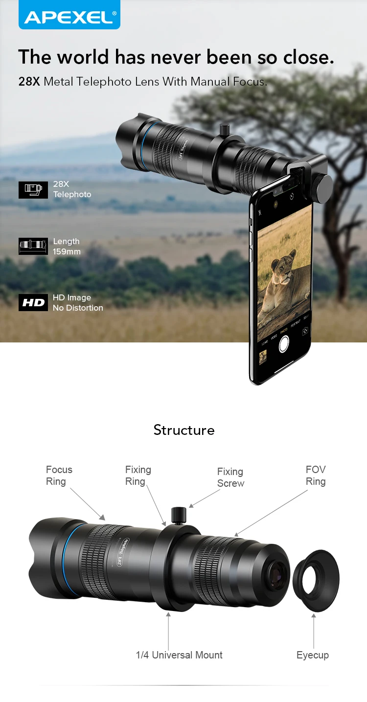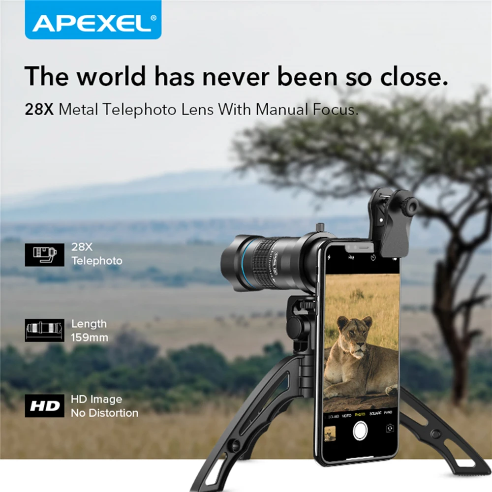 Монокулярный телескоп APEXEL, высокомощный телеобъектив 28X HD с триподом для селфи, подходит для смартфонов iPhone 13, 12 X, XR, Xiaomi