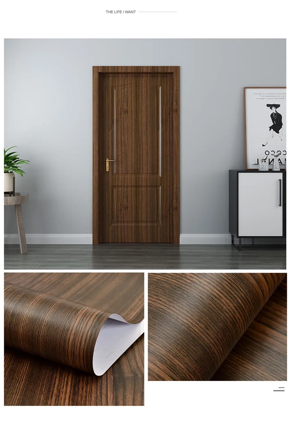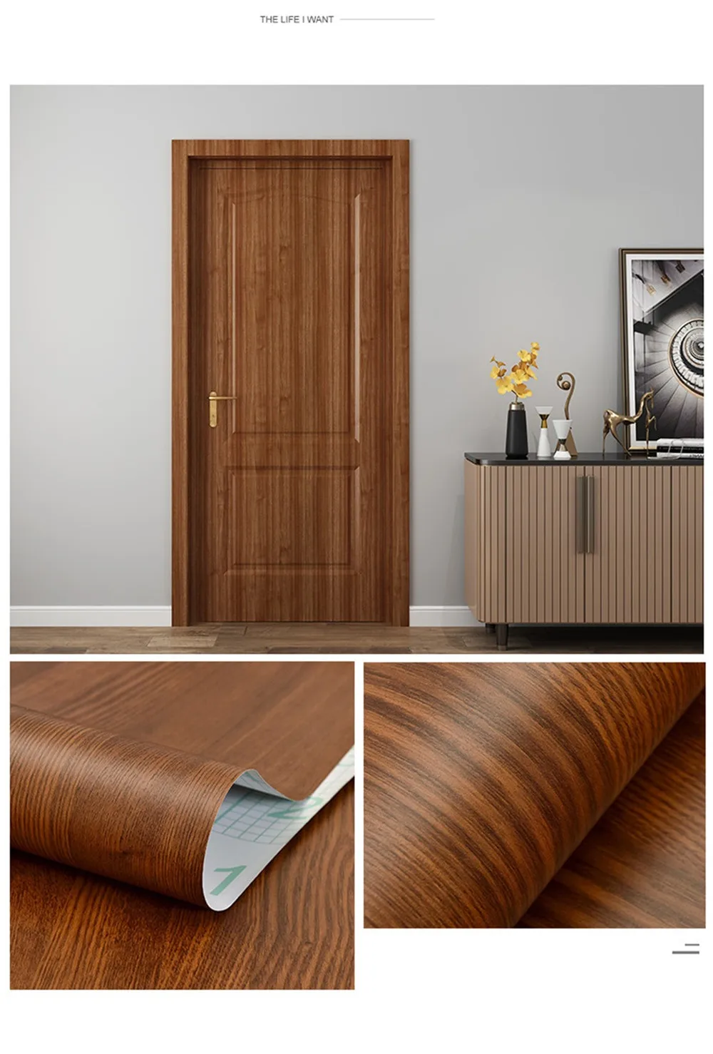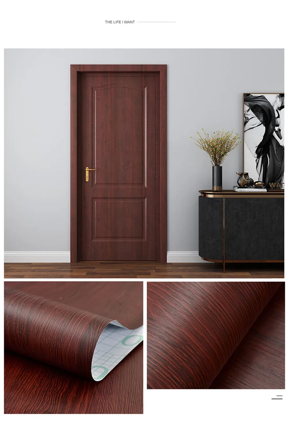 1. Размер изделия:Размер A : 90x210 см (35,43x82,68 дюйма)Размер B : 30x500 см (11,81x196,85 дюйма)2. Функция:А) Ремонт отделки дверей, ремонт мебелиB) самоклеющиеся, водонепроницаемые, съемныеВ) мы используем бумажные трубки для защиты наклеек, чтобы предотвратить сгибание наклеек во время транспортировки.D) для лучшей установки, пожалуйста, посмотрите Наше Видео установки перед установкой.
