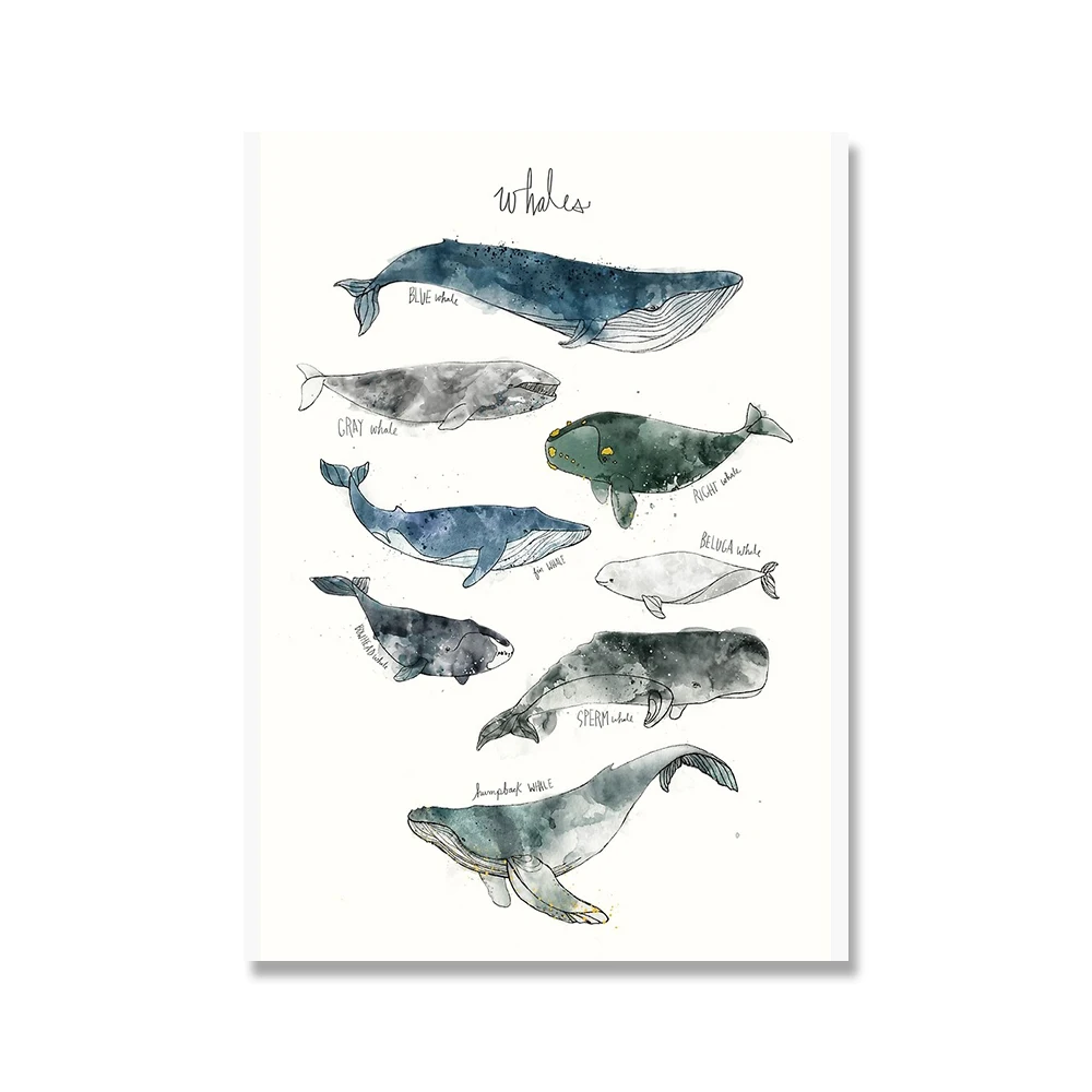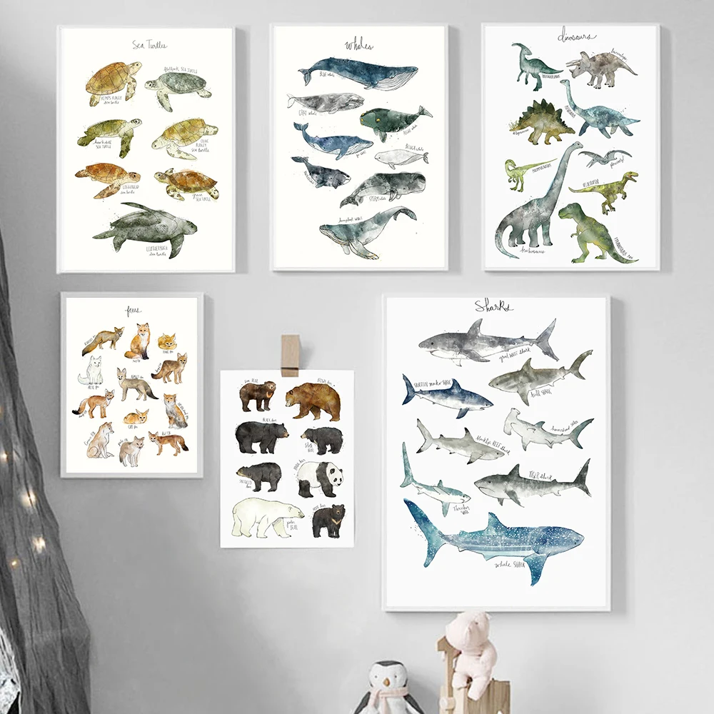 Детский плакат с динозаврами, китами, акулами, лисами, медведями, животными для детской комнаты, Художественная печать, образование, Настенная картина, декор для детской комнаты