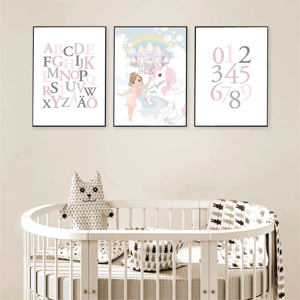 Сказочная земля мультфильм девочка Единорог замок Лебедь настенная Картина на холсте скандинавские постеры и искусство Декор детской комнаты девочки