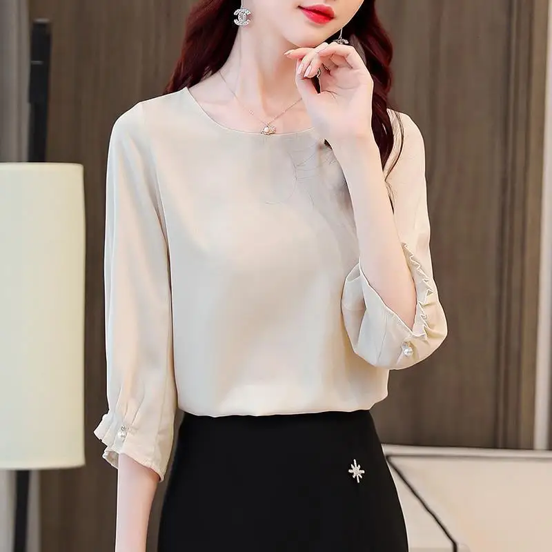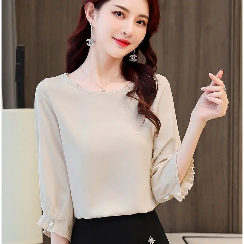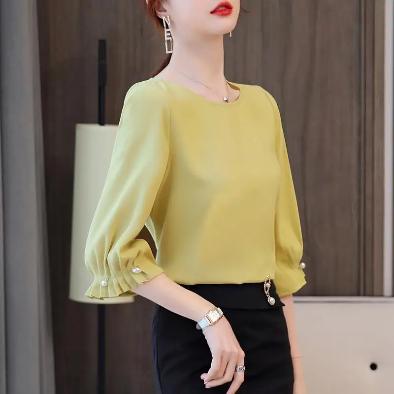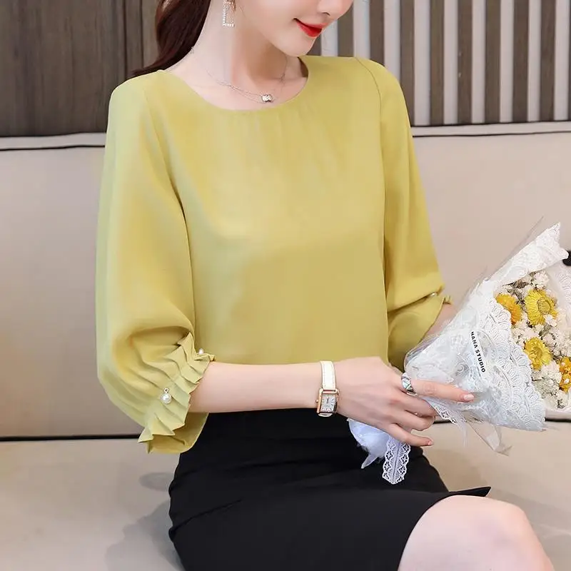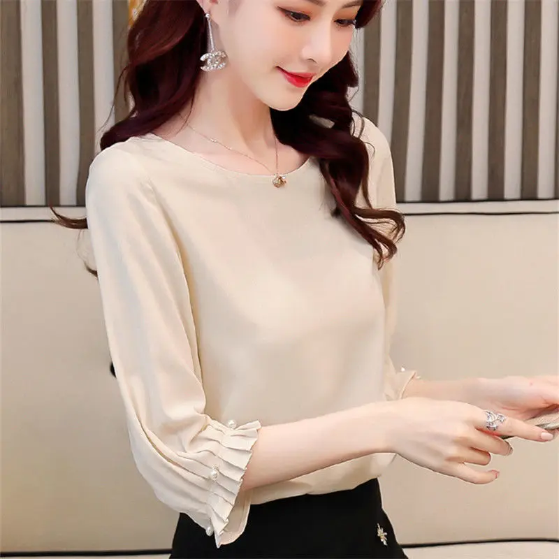 Женская обувь; Сезон весна-лето Стиль шифоновые блузки рубашка для женщин однотонные Цвет платье с О-образным вырезом и рукавом три четверти корейские свободные топы DD9069