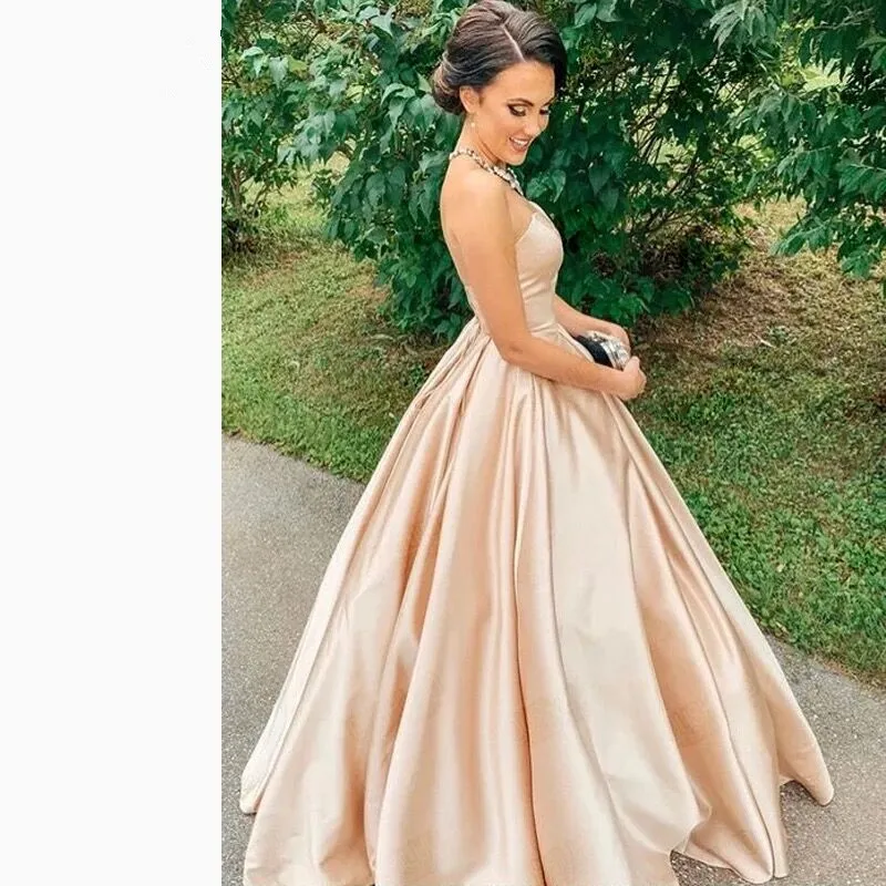 Пышное ТРАПЕЦИЕВИДНОЕ платье для выпускного вечера, милое атласное платье цвета шампанского с открытой спиной, напольная Длина платье принцессы с оборками на заказ