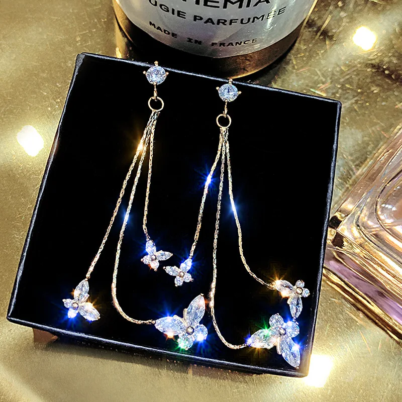 Длинные висячие серьги-бабочки, 3 цвета, 2020, модные висячие серьги с цирконием, три бабочки, женские серьги, летнее ювелирное украшение, подарок для девочек