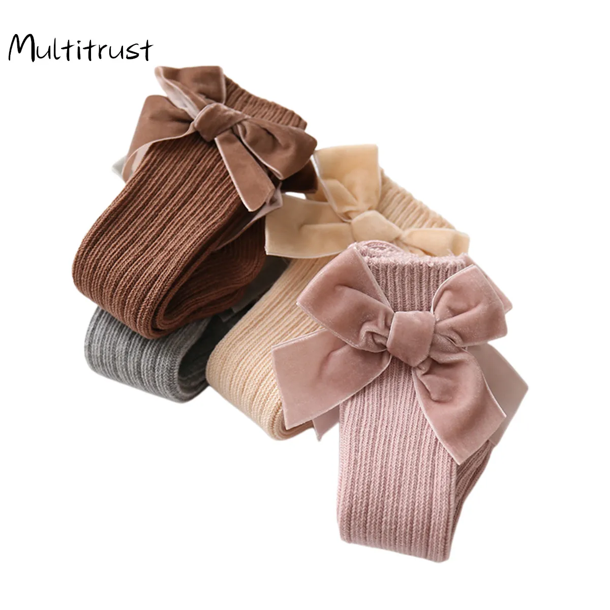 Детские бархатные носки с бантиком для девочек, детские носки-трубы с бантиком, милые вязаные носки до колен из искусственной шерсти для малышей