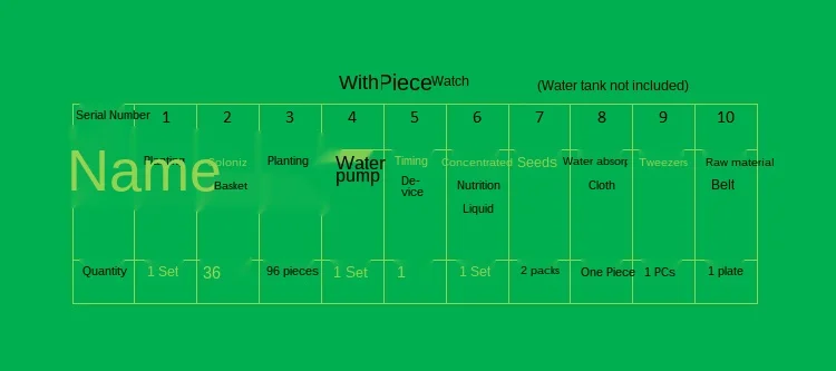 Одна единица включает в себя:1, frame-1set трубки (необходимо установить)2. Корзина для посадки-36 шт.3,Контроллер синхронизации-1 шт.(Только 220 В)4,Водяной насос-1 шт.5,Губка-96 шт6,Tweezers-1pc7,Абсорбирующий cloth-1pc8,Ремень из сырья-1 шт.Примечание:* Все фитинги включены в качестве полной системы. НоСиний резервуар для воды в комплект не входит*