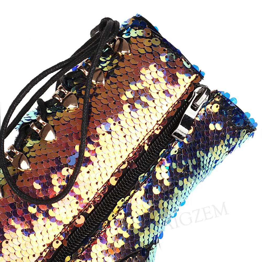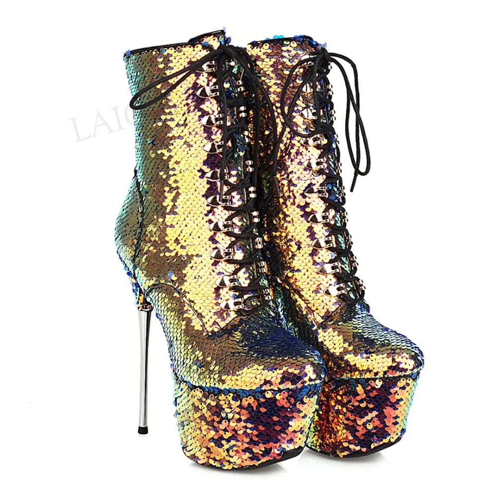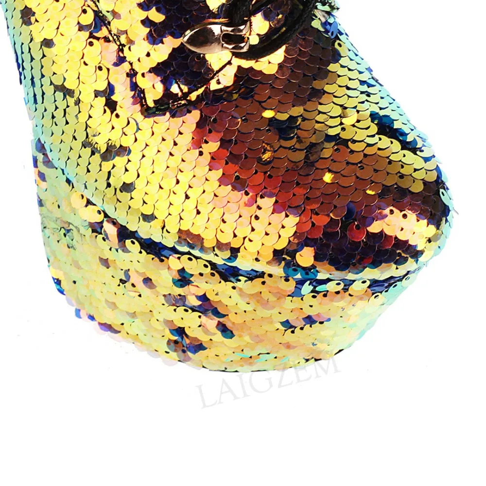 LAIGZEM/женские ботинки; Блестящие ботильоны на высоком металлическом каблуке с 2 сторон; Клубная обувь для вечеринок; Botas Mujer; Большие размеры 33, 42, 43