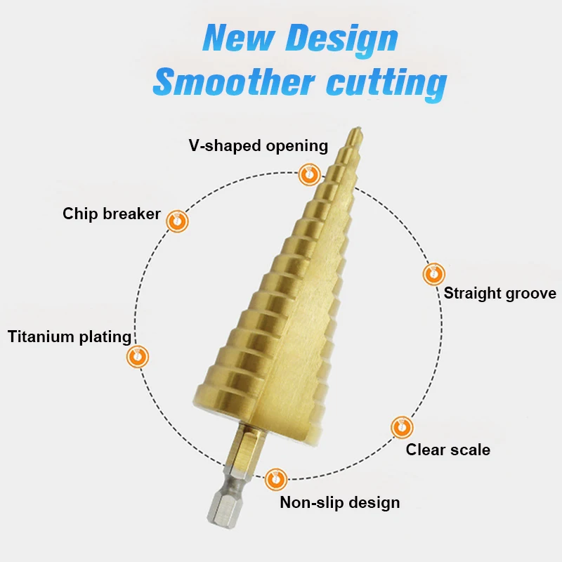 Это новая быстрорежущая сталь с большим шаговым Конусным сверлом, титановый набор сверл, который сделан из высококачественной быстрорежущей стали и с титановым покрытием, чтобы уменьшить трение и тепло