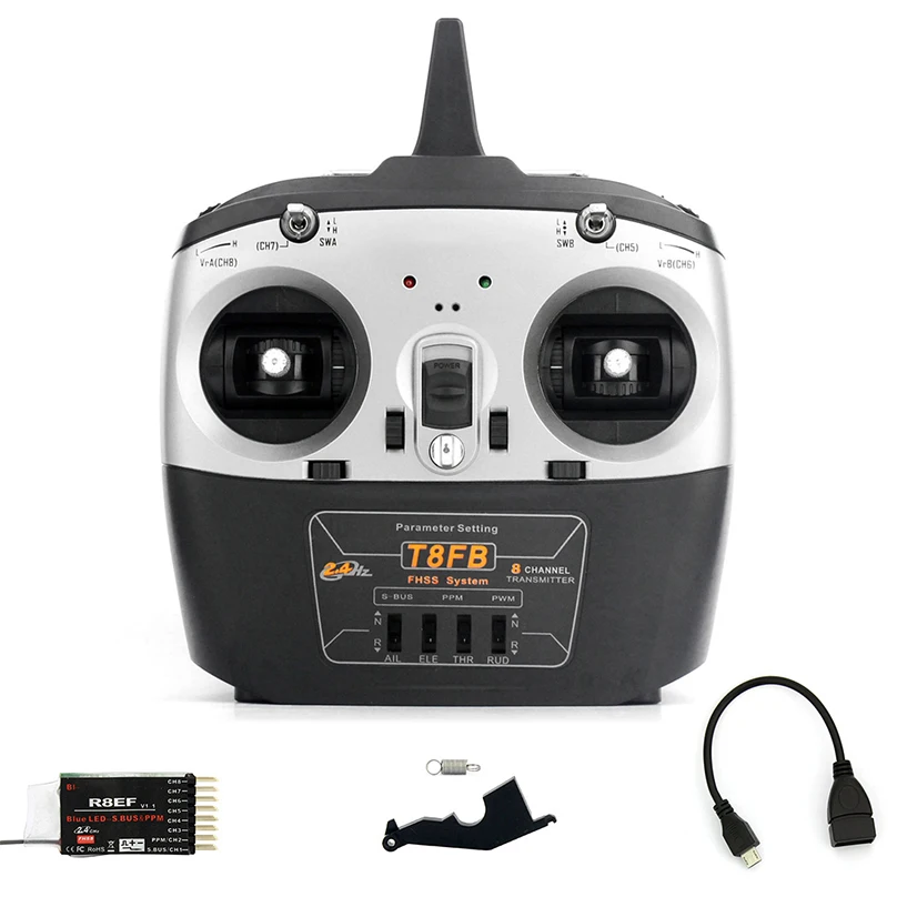 1. Размер: T8FB - 173*102*206 мм, R8EH-48,5*21*11 мм.2. Вес: 0,47 кг (включая R8EH)3. Частота: диапазон ISM 2,4 ГГц (2400 ~ 2483,5 МГц)4. Режим модуляции: GFSK5. Полоса пропускания каналов: 400 кГц6. Ширина диапазона: 1200 кГц7. Спектр распространения: FHSS8. Отклонение соседнего канала: >36 дБм9. Мощность передатчика: <100 мВт (20 дБм)10. Чувствительность: -104 дБм11. Скорость: 38 кбит/с12. Выход ШИМ: 1,0 мс ~ 2,0 мс13. Точность секции: 2000, МКС на Секцию14. Цикл: 15 мс/кадр15. Радио T8FB Рабочее напряжение: 4,8 В ~ 18 В16. Радио T8FB Рабочий ток: <110 мА17. Рабочее напряжение приемника R8EF: 4,6 ~ 10 В18. Рабочий ток приемника R8EF: <30 мА19. Дистанция управления: более 1000 метров воздуха, фактическая Дистанция управления зависит от условий полета.